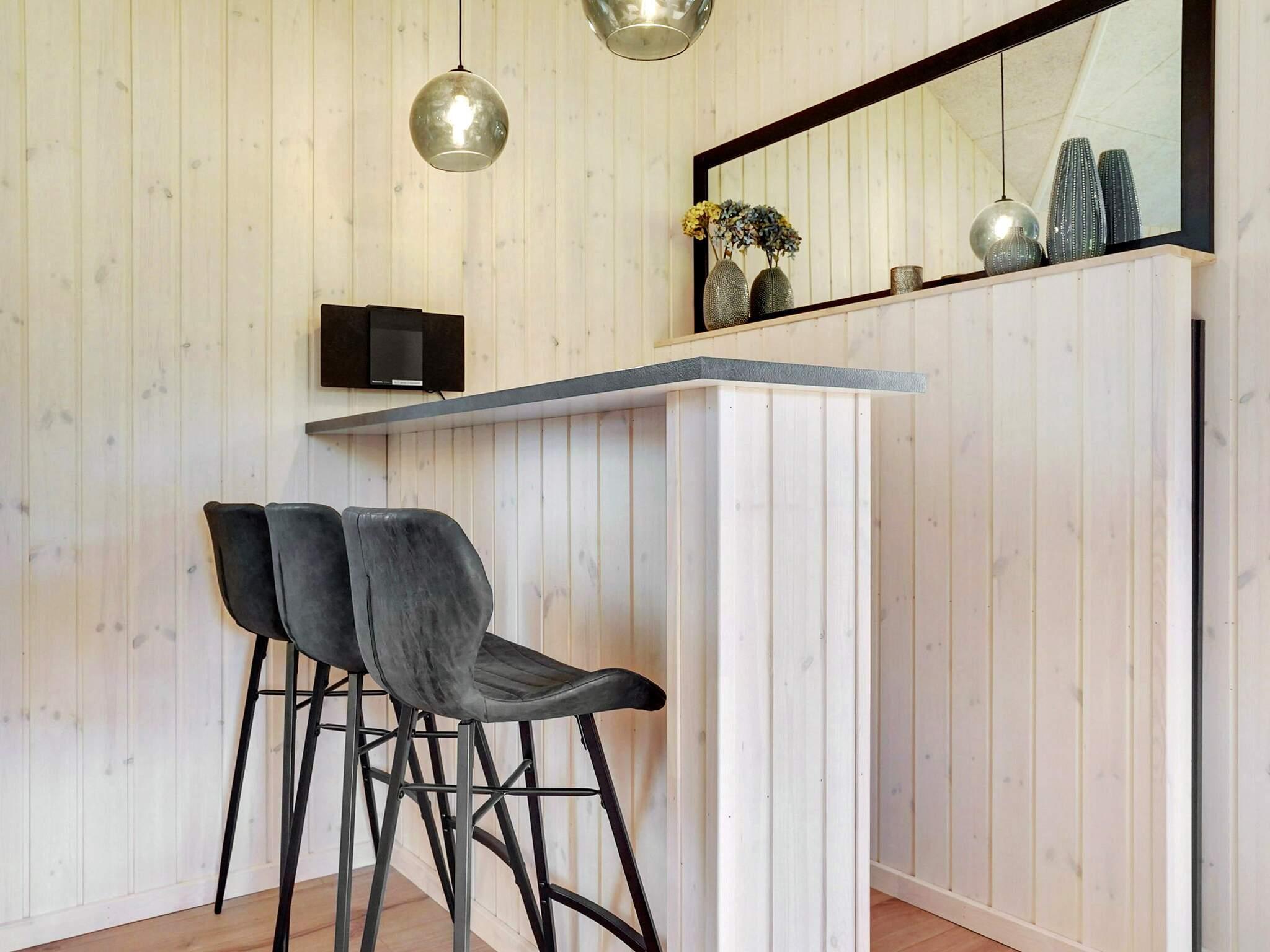 Midt i huset finder I køkken/alrum med god plads til madlavning for hele familien. Køkkenet er veludstyret og åbent, så madlavning og snak kan nemt kombineres. Foran køkkenet er der plads til alle ved det lange spisebord. På kølige dage kan du tænde op i brændeovnen i stuen, mens du slapper af i sofaen med en god bog eller ser fjernsyn.