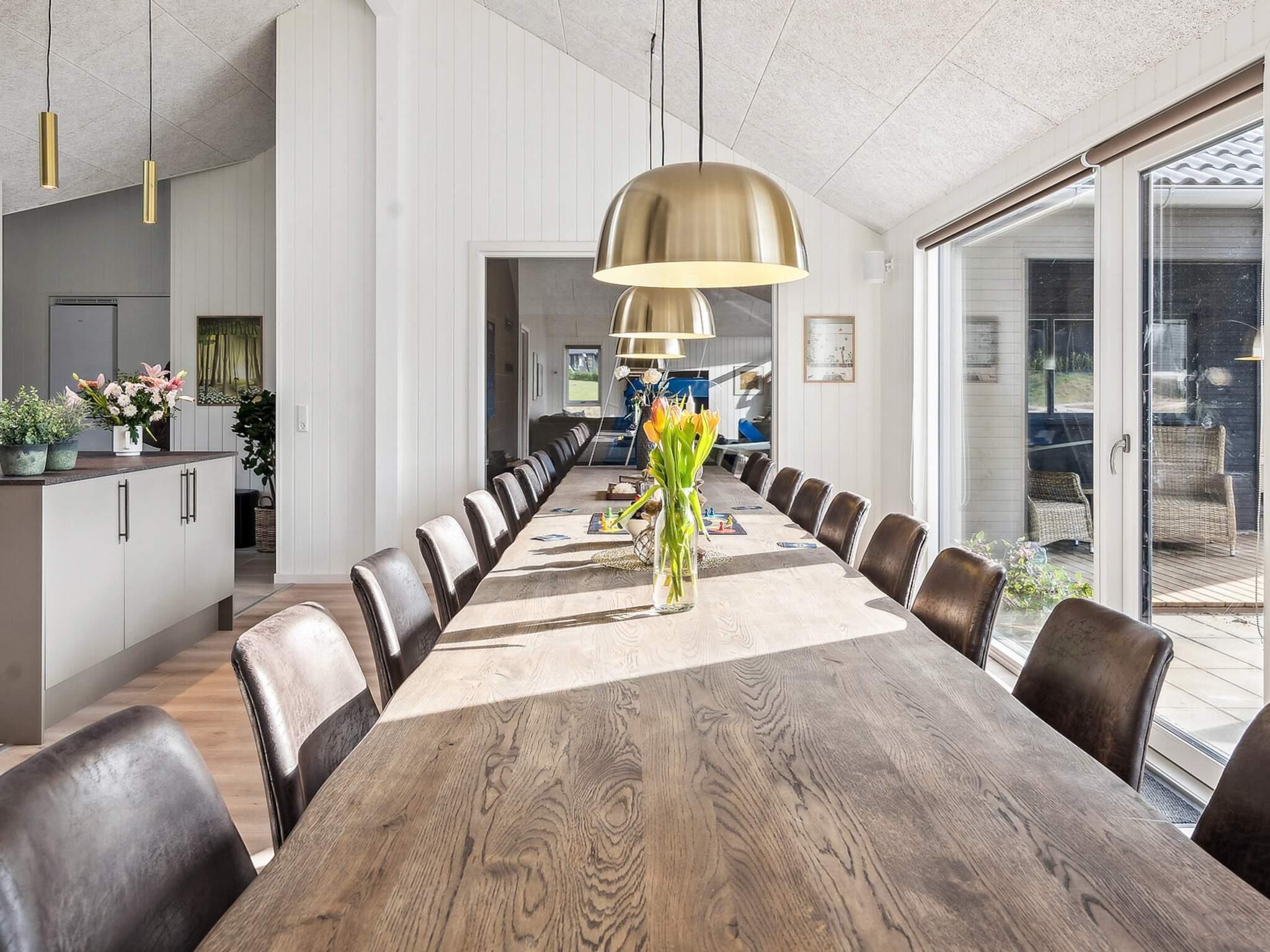 I idylliske Mommark finder I dette dejlige luksusferiehus til 18 personer, beliggende tæt på en skøn sandstrand, en lille havn med fiskerbåde, og skøn natur med muligheder for vandre- eller cykelture. Feriehuset har syv soveværelser, tre badeværelser og en hyggelig hems, som især børn vil elske. Der er taget ekstra hensyn til indretningen af det store køkken-alrum, der fungerer som omdrejningspunktet for huset med et fuldt udstyret XL-køkken med 2 ovne og 2 opvaskemaskiner, et langt flot mahogni spisebord med plads til alle, samt en behagelig sofagruppe med brændeovn. Her er rig mulighed for hyggeligt samvær og gode måltider. Aktivitetsrummet, der er forbundet med køkken-alrummet, byder på masser af sjov. Der er billard, bordtennis, bordfodbold og dart, samt en bar, hvor du kan nyde forfriskninger, mens du konkurrerer i de mange spil. Derudover kan du også slappe af i loungemøblerne i aktivitetsrummet, måske med en film, der giver en perfekt balance mellem aktivitet og afslapning. Huset har eget poolområde, hvor man kan bade og lege i timevis, med plads til både store og små børn. Udenfor finder du et wellness-område med en lille overdækket træterrasse, sauna, udendørs spa og udendørs bruser, hvor du kan slappe af under åben himmel. For de yngste gæster er der masser af underholdning i haven med trampolin, som garanterer mange timers sjov. Imens kan de voksne nyde en grillmiddag eller slappe af på den delvist overdækkede terrasse med komfortable havemøbler. For lystfiskere har huset sit eget udendørs fiskerensningsområde med bord, vask og vandhane. Området omkring huset byder også på en stor multisportsplads og en legeplads, der omfatter et spændende piratskib. Her er borde og bænke, så de voksne kan hygge sig, mens børnene leger og udforsker området. Huset er desuden udstyret med ladestander til elbiler, så du kan oplade din bil direkte ved huset. Dette hus kombinerer komfort, sjov og afslapning og er det perfekte valg til en ferie fuld af oplevelser og sjov på Mommarks fredelige kystlinje, hvilket gør det til det ideelle sted for en afslappende ferie ved vandet. Med projektor og lærred er huset også velegnet til mindre kurser.