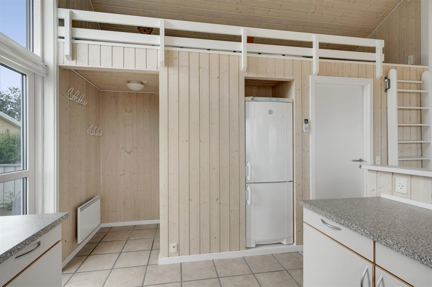 Køkkenet er udstyret med 1 køleskab. Der er 4 keramiske kogeplader, varmluftovn, mikrobølgeovn samt opvaskemaskine Der er gulvvarme i køkkenet.