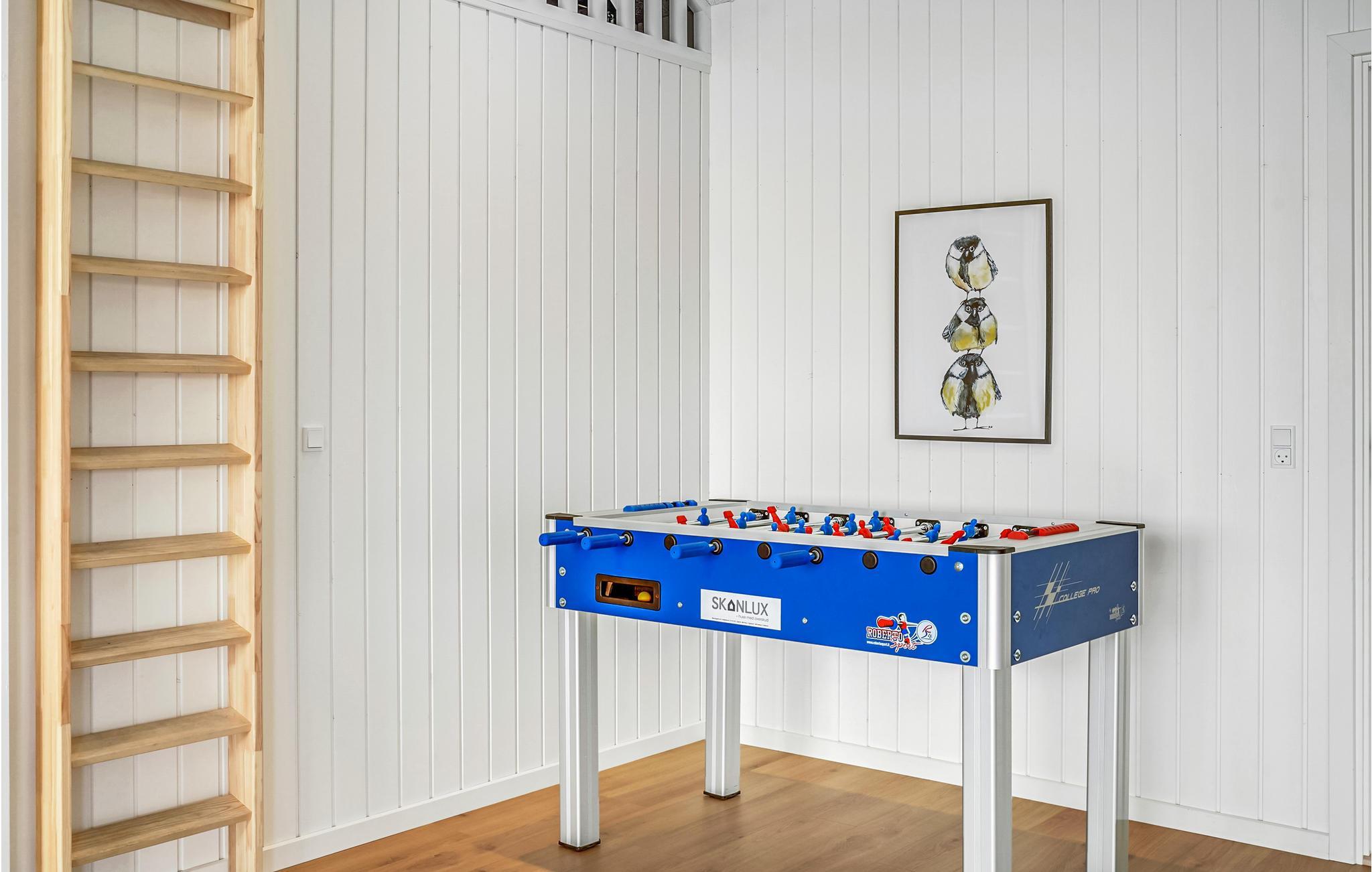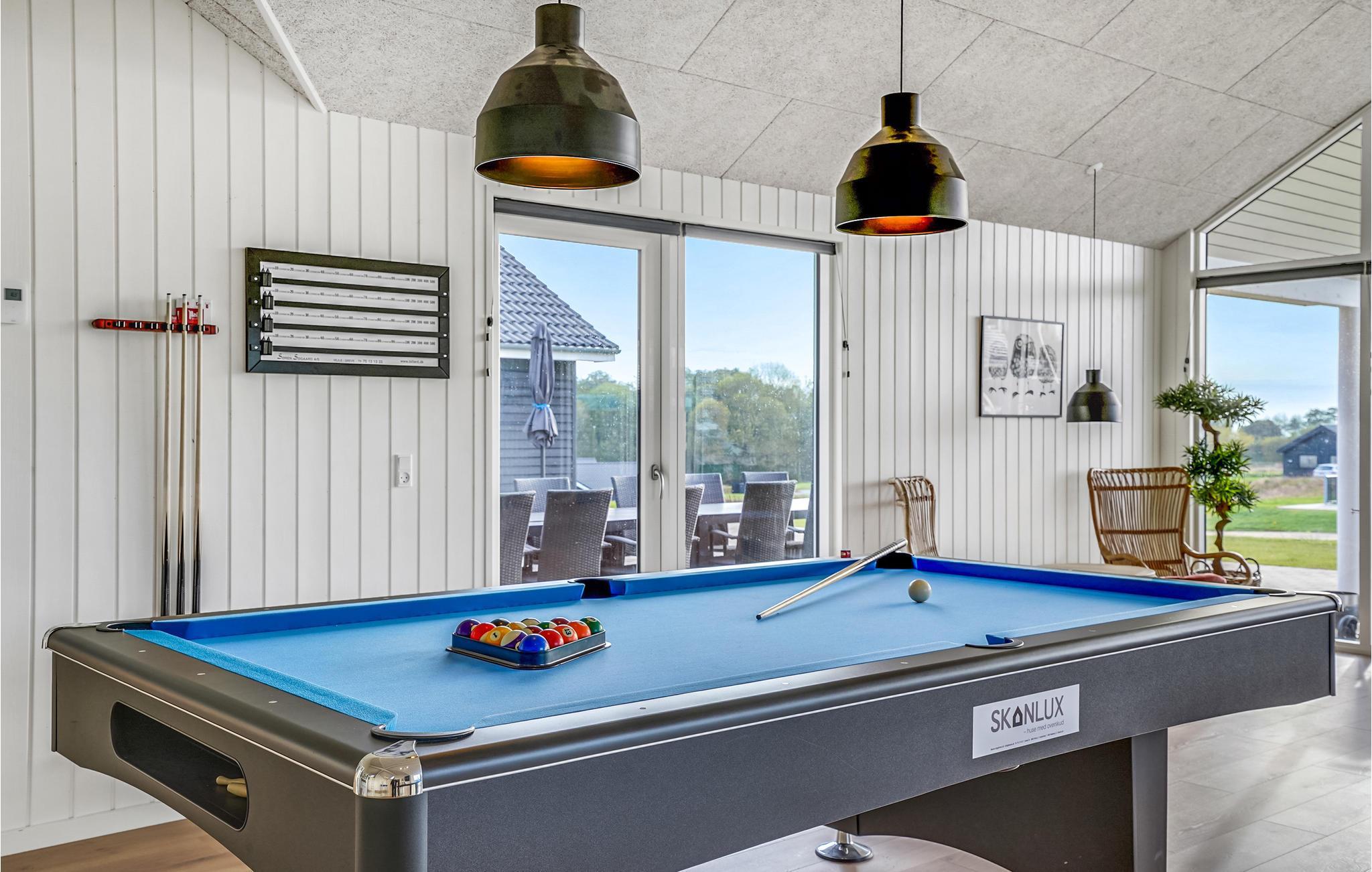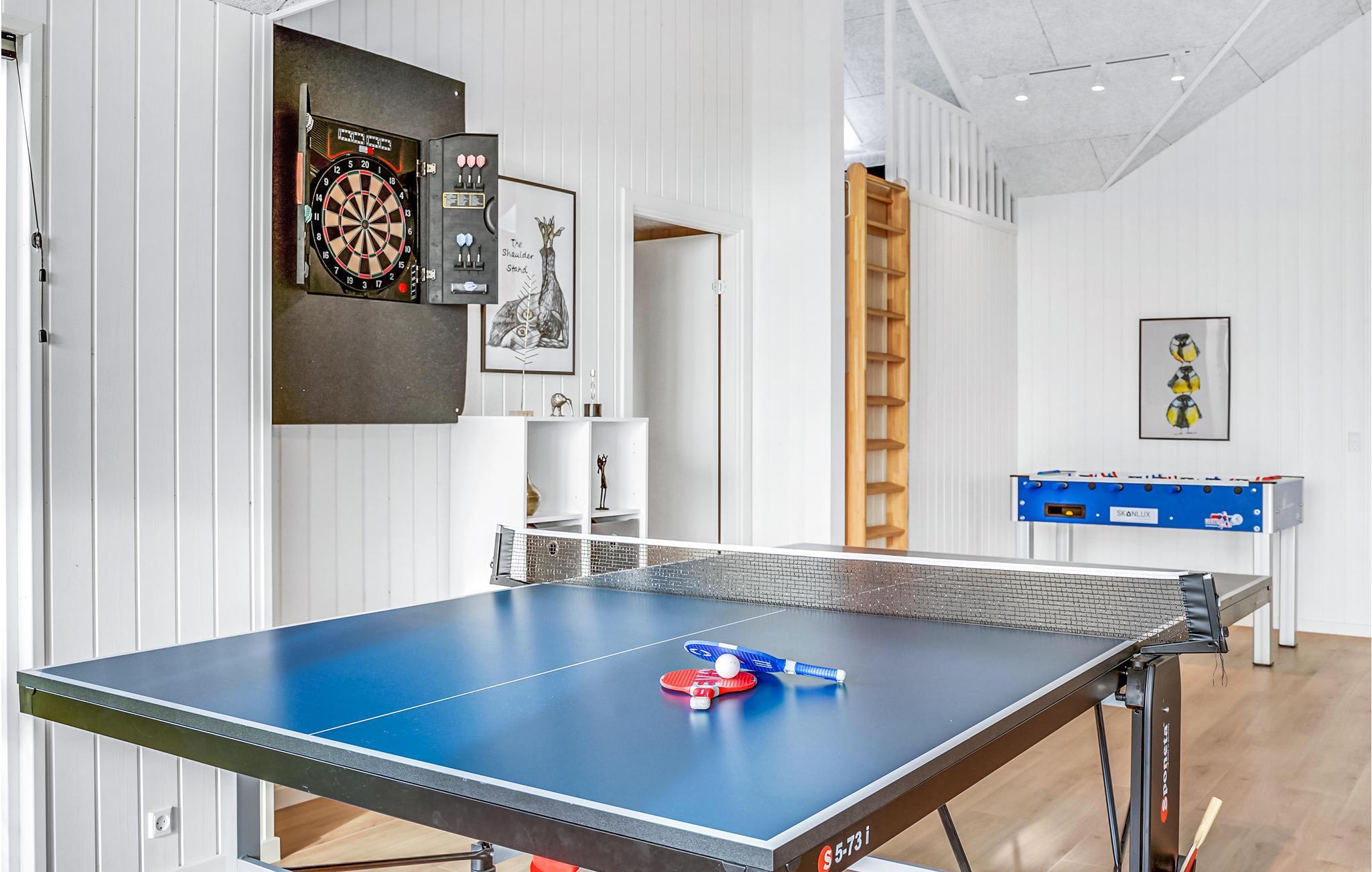 Dette fremragende sommerhus lader intet tilbage at ønske, hvis I drømmer om at holde ferie med en stor gruppe venner. Her kan I nemlig se frem til virkelig flotte faciliteter og en lang række aktivitetsmuligheder. De 10 soveværelser og fire badeværelser sørger for god plads til alle. Brug dagene på hyggelige stunder, der kan omfatte alt fra billard i aktivitetsrummet, tilbagelænet afslapning i spabadet, motion og vandplaskeri i indendørspoolen eller sol på terrassen, hvor der både står havemøbler og en grill.