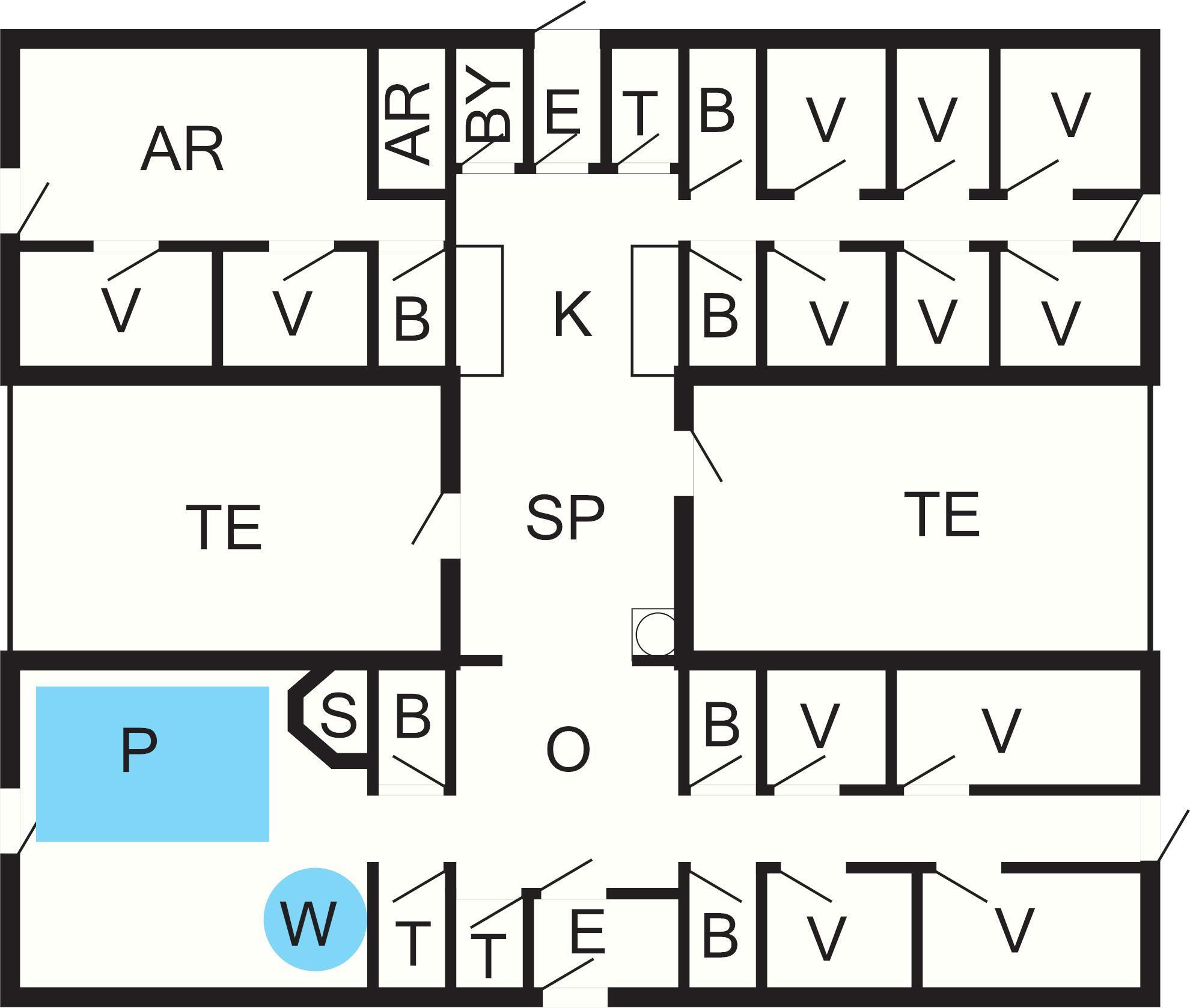 12 Soveværelser: (1DS)+(1DS)+(1DS)+(1DS)+(1DS)+(1DS)+(1DS)+(1DS)+(1S)+(1S)+(1DS+1S)+(1DS+1S), barneseng