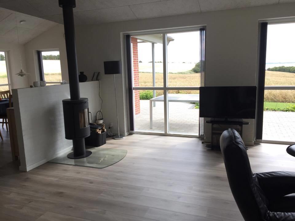 Huset opvarmes via jordvarme og der er også brændeovn.