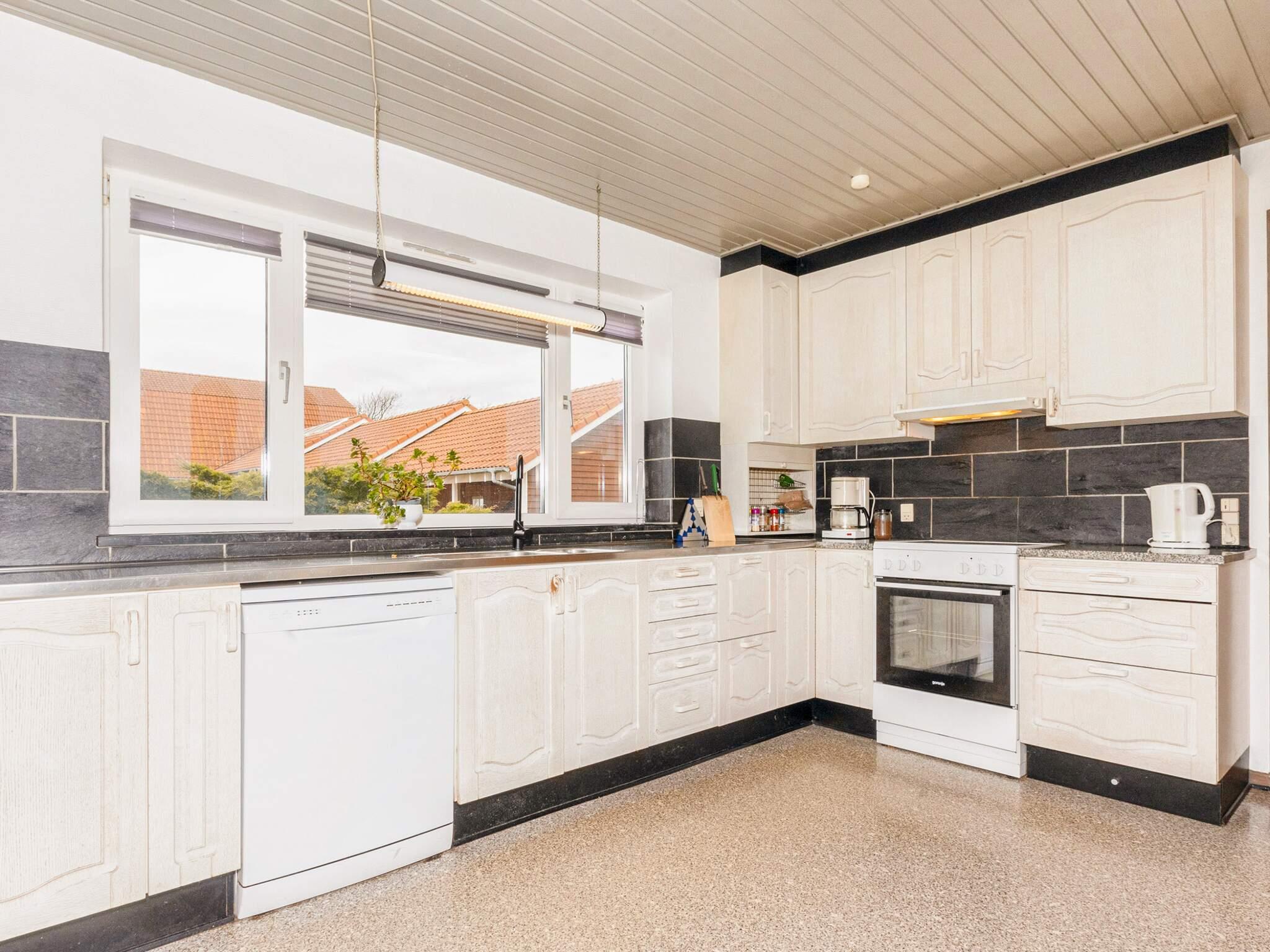Køkken med bl.a. el-komfur, køleskab, mikroovn, stor fryser, kaffemaskine samt opvaskemaskine. Badeværelse med bademiljø, bruser og toilet. Derudover bryggers med vaskemaskine og tørretumbler.