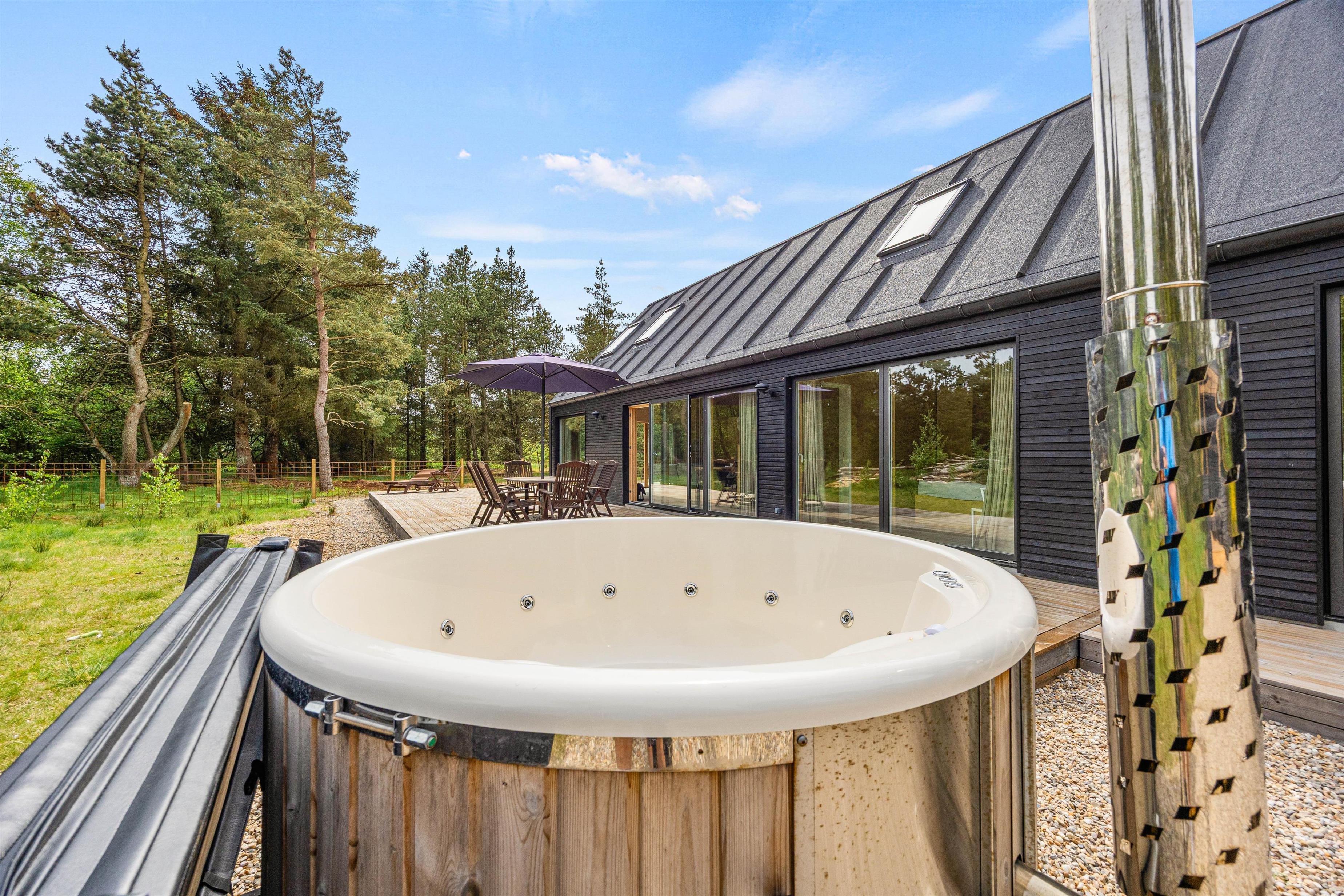 Beliggende i Dalen 18, kun få minutter fra Ho Bugt, er dette et paradis for naturelskere. Med 129 m² boligareal kan dette feriehus fra 2023 rumme op til 5 personer. Nyd luksuriøse faciliteter som et vildmarksbad, 2 badeværelser med gulvvarme og en effektiv luft-til-vand-varmepumpe, så din ferie bliver behagelig hele året rundt, og oplev freden og roen på en stor, indhegnet naturgrund på 2562 m², hvor din hund også er meget velkommen.