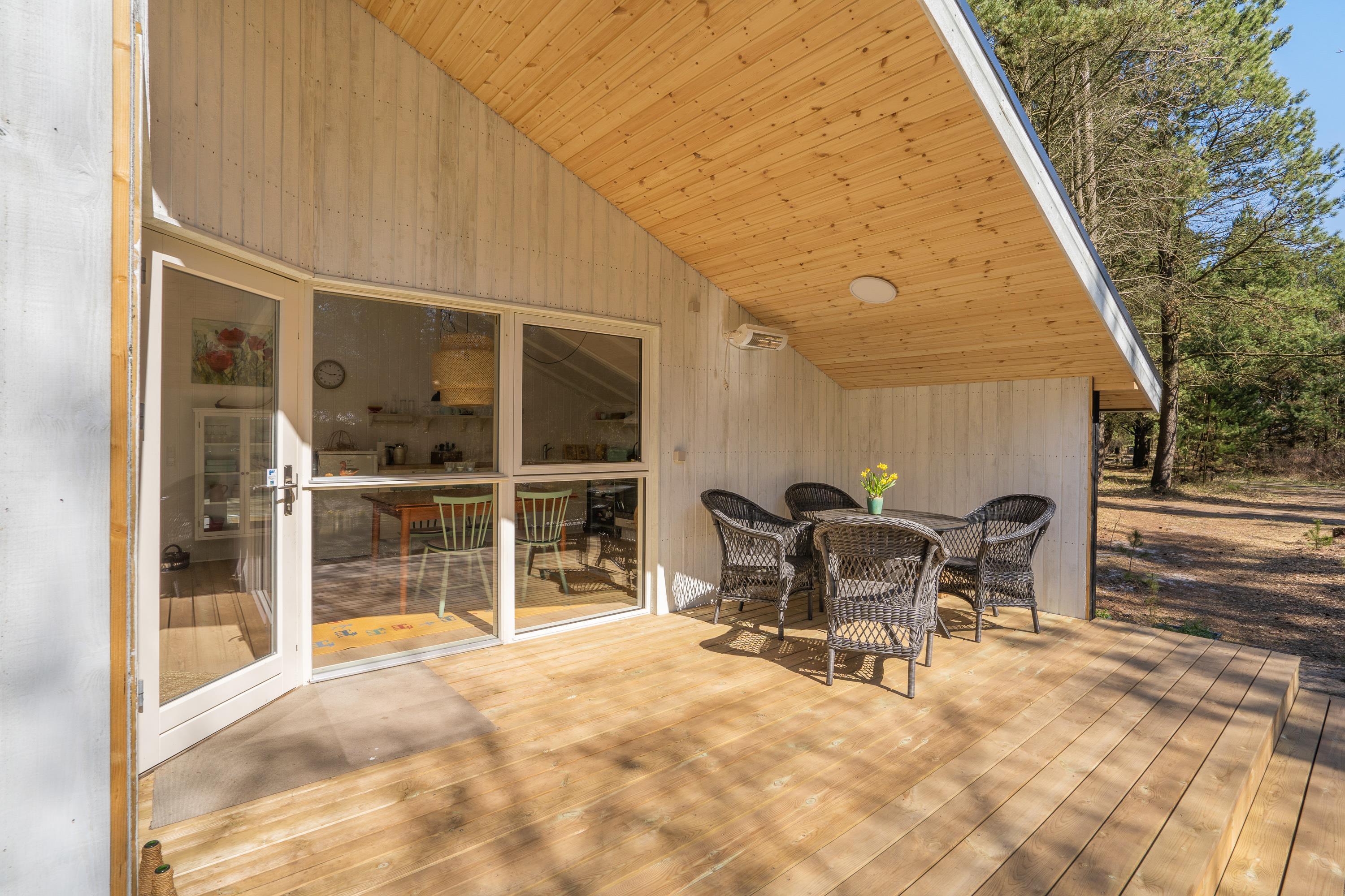 De grønne omgivelser er indbegrebet af sommerhusidyl, og I får en helt unik beliggenhed på en naturskøn og ganske uforstyrret plet i Vejers. Der er både en overdækket terrasse og masser af hyggelige kroge (samt en udendørs bruser), hvor I kan nyde den friske luft og en god kop kaffe, mens fuglene kvidrer i trætoppene. Måske er I også heldige at få besøg af skovens beboere, som rådyr og egern?