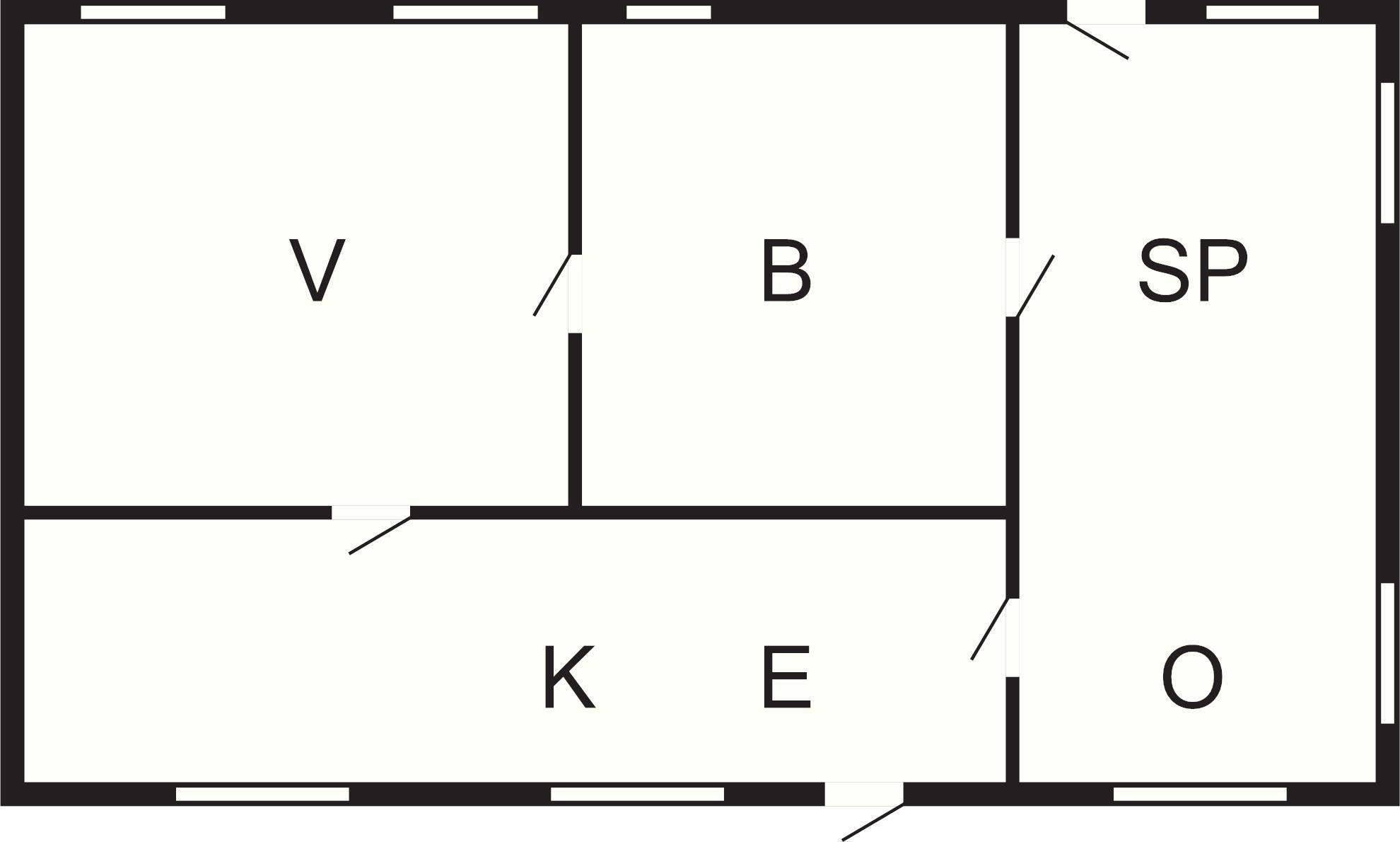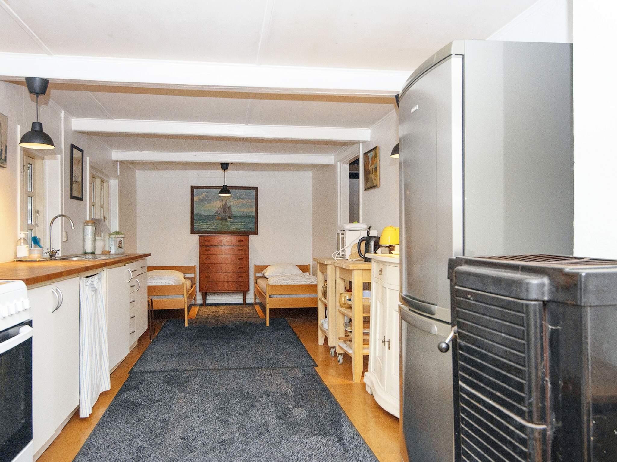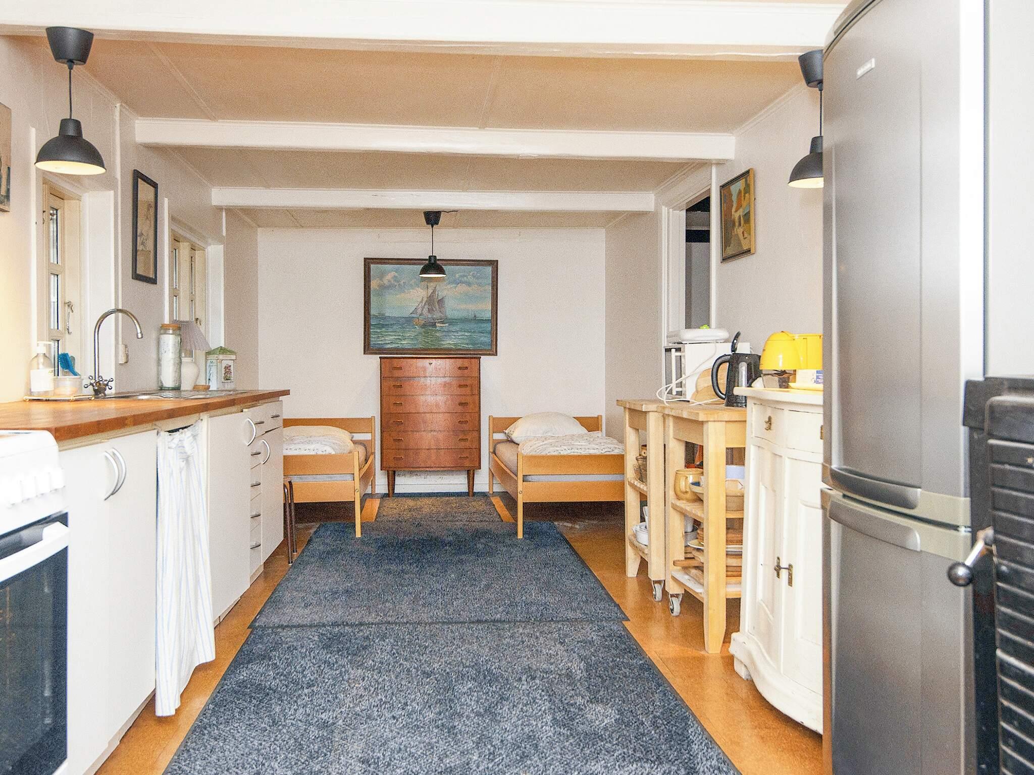 Huset har stort soveværelse med tre senge og for enden af køkkenet finder I yderligere to senge (bemærk at det er ét stort rum).