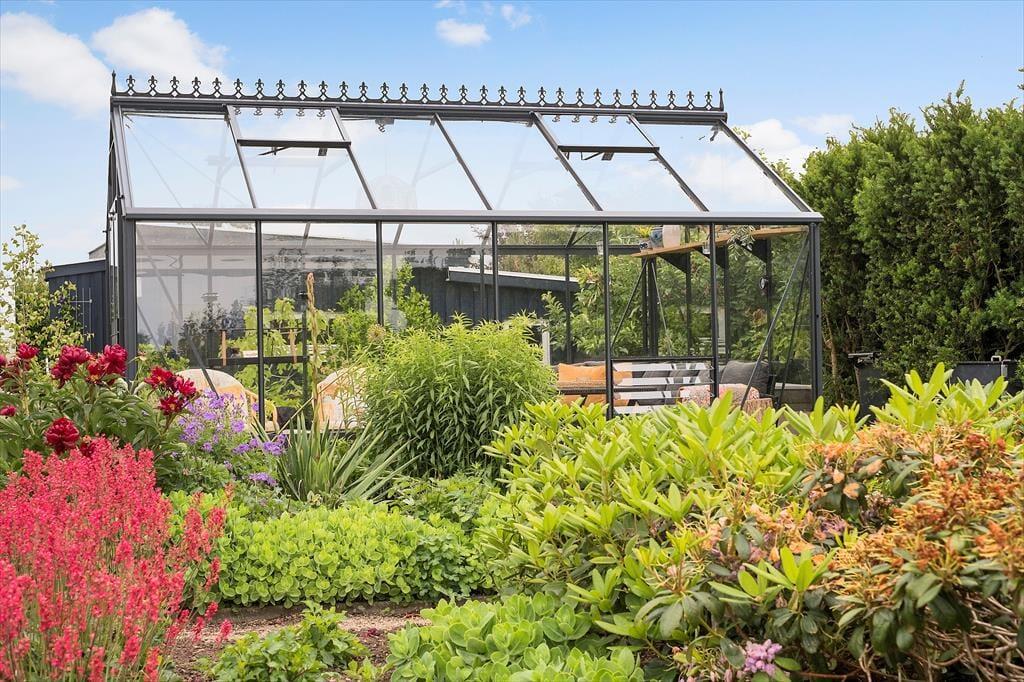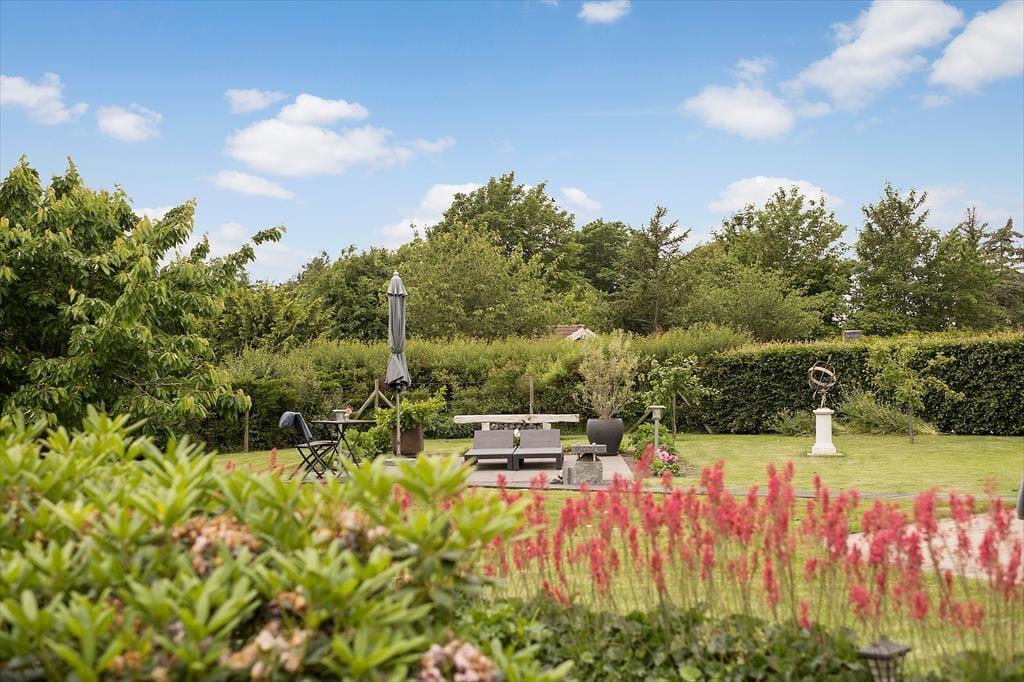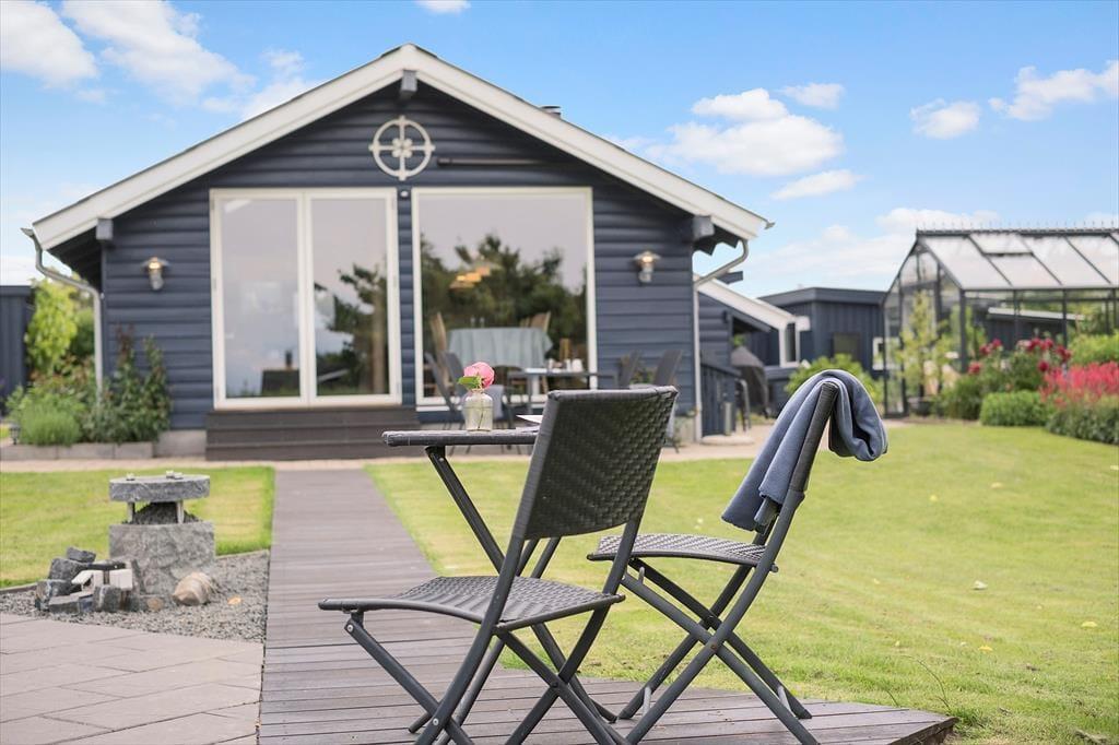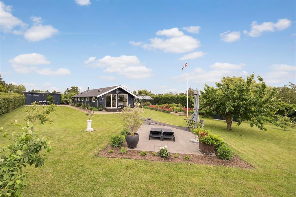 Feriehuset har en dejlig indhegnet og ugeneret grund på 1194 m3 med flere skønne terrasser som går hele vejen rundt om huset, samt en solgård foran huset, hvor morgensolen kan nydes. Desuden er der en hyggelig udestue på 12 m3. Ved feriehuset er der havemøbler, liggestole, parasol, udendørs bruser med varmt og koldt vand, og Weber grill Performer (gastænding). Ved huset er der desuden carport og ladestander til elbil.