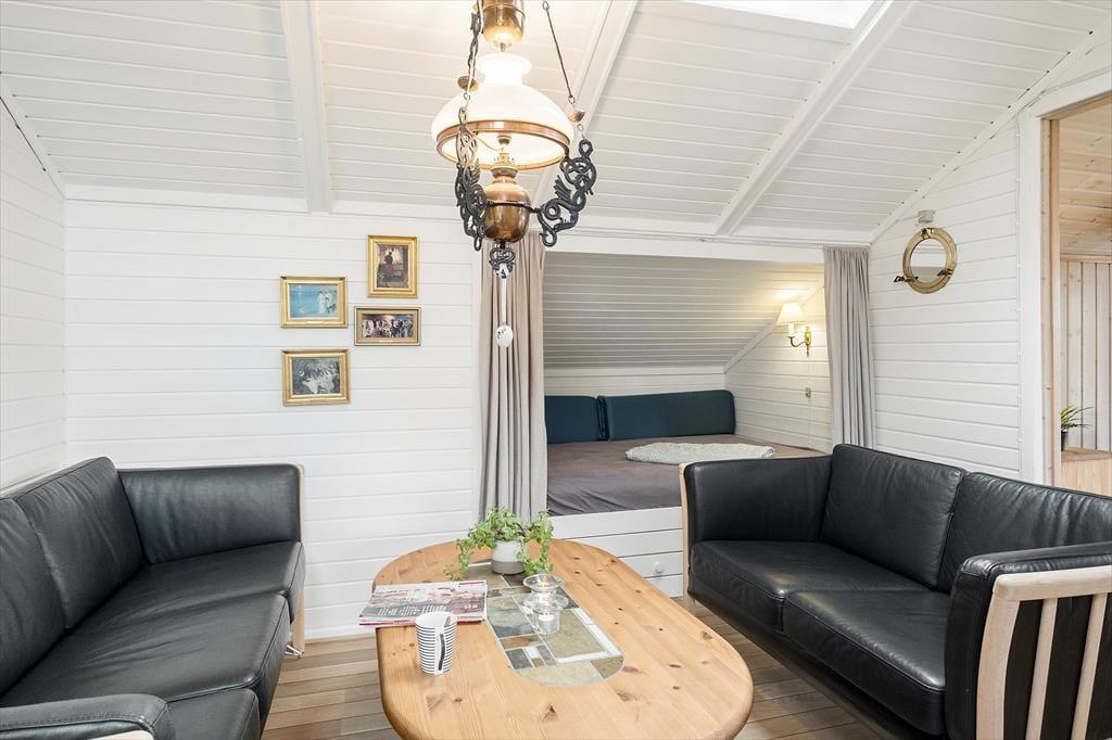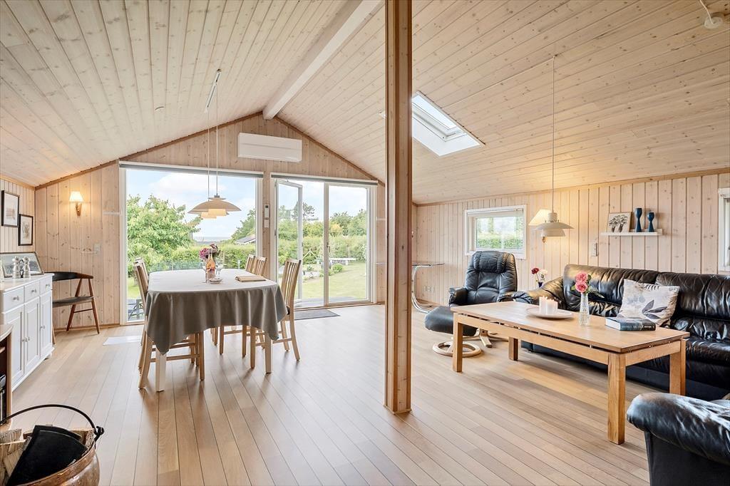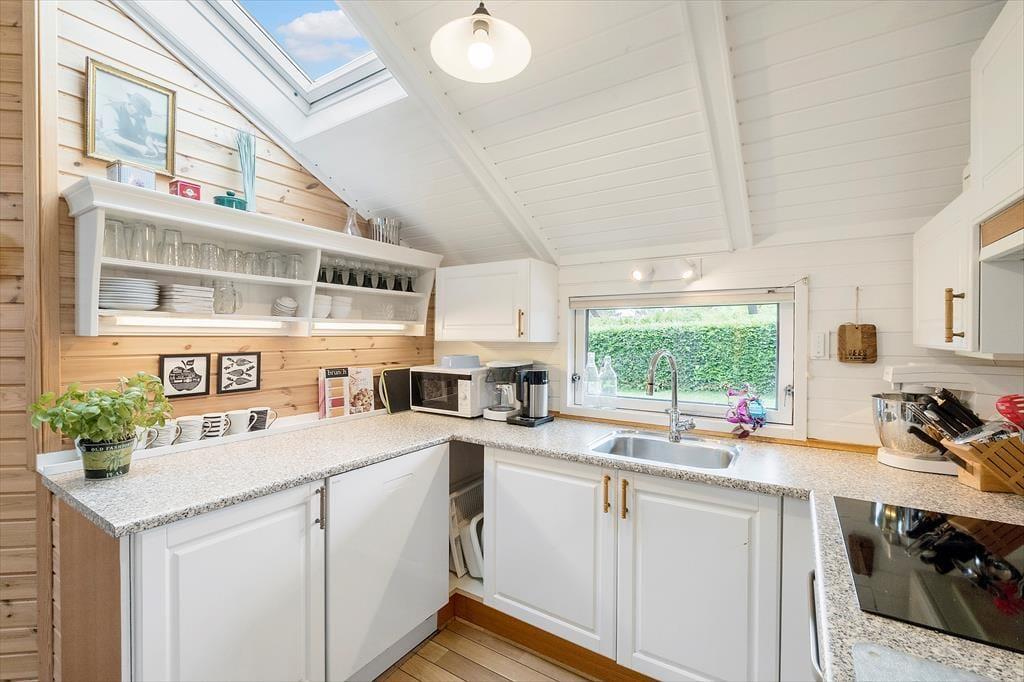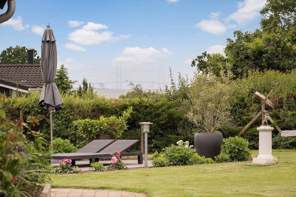 Feriehuset, som er helårsisoleret, er indrettet med kombineret køkken og opholdsstue. Charmerende og lyst køkken med indbygningsovn, kogeplader med induktion, køleskab med fryser, opvaskemaskine og toaster. Dejlig lys opholdsstue med direkte udgang til terrasse, Hvorfra der er kig til Storebælt og Storebæltsbroen. I stuen er der brændeovn, loft til kip og et godt lysindfald via ovenlysvinduer og store vinduespartier. God spiseplads og hyggeligt sofahjørne med bløde møbler og stort 65 fladskærms-TV med Soundbar, Allente abonnement inklusive sportspakken, samt parabol med tyske kanaler og en Xbox 360 spillekonsol med Kinect og 4 controlleres plus en del spil.12 m2 hyggelig udestue. Badeværelse med gulvvarme, bruseniche, vaskemaskine og tørretumbler. 4 soverum. Et med 1 dobbeltseng, et med dobbeltseng og bred køje (90x200) foroven, alkove med dobbeltseng og anneks med enkeltseng (kan trækkes ud til dobbeltseng). I annekset er der en PS4 spillekonsol med 2 controllers til rådighed. Der er desuden også barneseng og barnesæde til rådighed i huset. Huset opvarmes med varmepumpe, brændeovn og elvarme