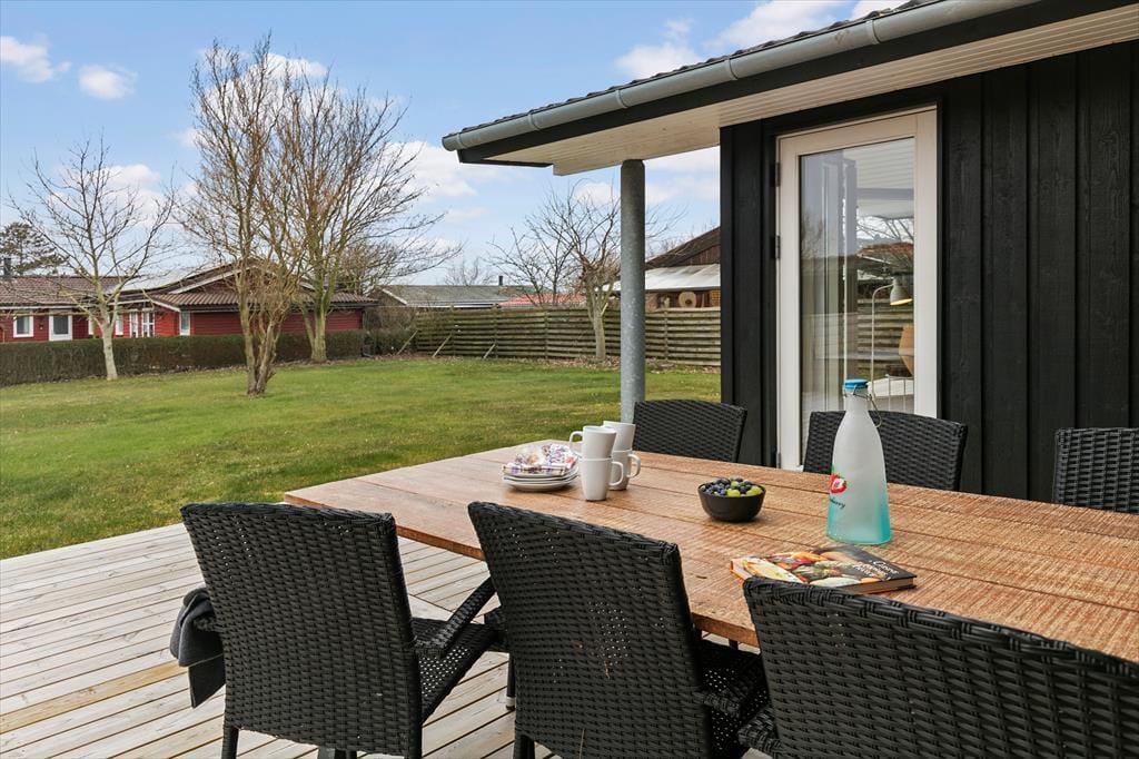1145 m2 grund med en stor træterrasse, som går rundt om det meste huset, en del af terrassen er delvist overdækket. Ved huset er der havemøbler, parasol og grill.