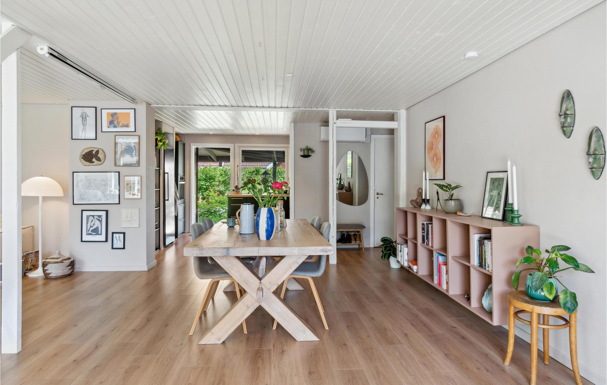 Her er lys, plads, charme, frisk søluft og vidunderlig natur kombineret med luksus. Det bliver ikke bedre! Dette hus er et paradis for den naturelskende familie, som sætter pris på eksklusiv komfort, og er den ideelle oase af fred til en skøn ferie i Nordsjælland. Forlad den hektiske hverdag og nyd husets lange række af goder. Værelserne er smagfuldt indrettet i stilrent design, og lyset strømmer ind. Hyg jer med madlavning i det moderne og fuldt udstyrede køkken, spil brætspil ved det lange massive træbord og slap af i en af husets mange hyggekroge. Den store træterrasse bidrager til ekstra sommerhygge med fashionable havemøbler. Læs en god bog på den store solseng under træet eller nyd solen på den anden solseng med kig til grønne trækroner og drivende lammeskyer og til duften af syrenens lyselilla blomster. Her er kun få skridt ned til søen og badebroen. Plask og forfrisk jer i søen, lej en kajak, en kano eller et SUPboard og udforsk søen. Lystfiskere kan også prøve lykken. Måske står der frisk fanget fisk på menuen i aften? I kan også tage på dejlige cykelture i området.