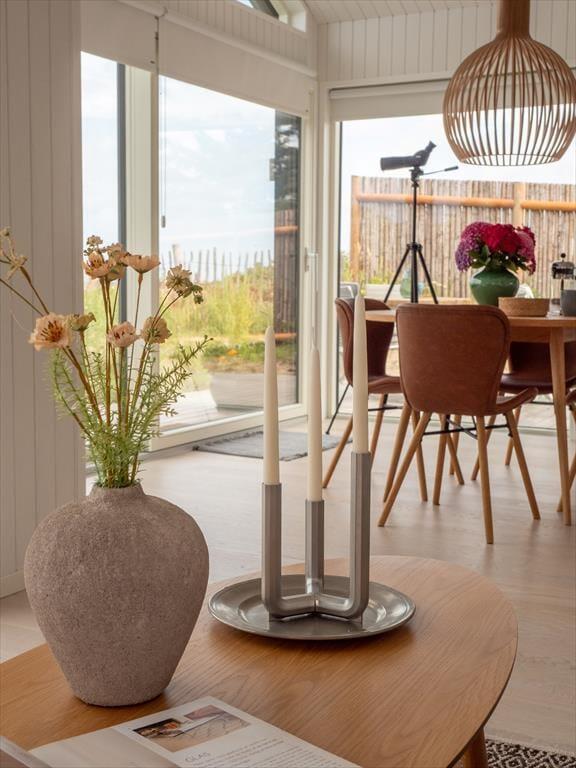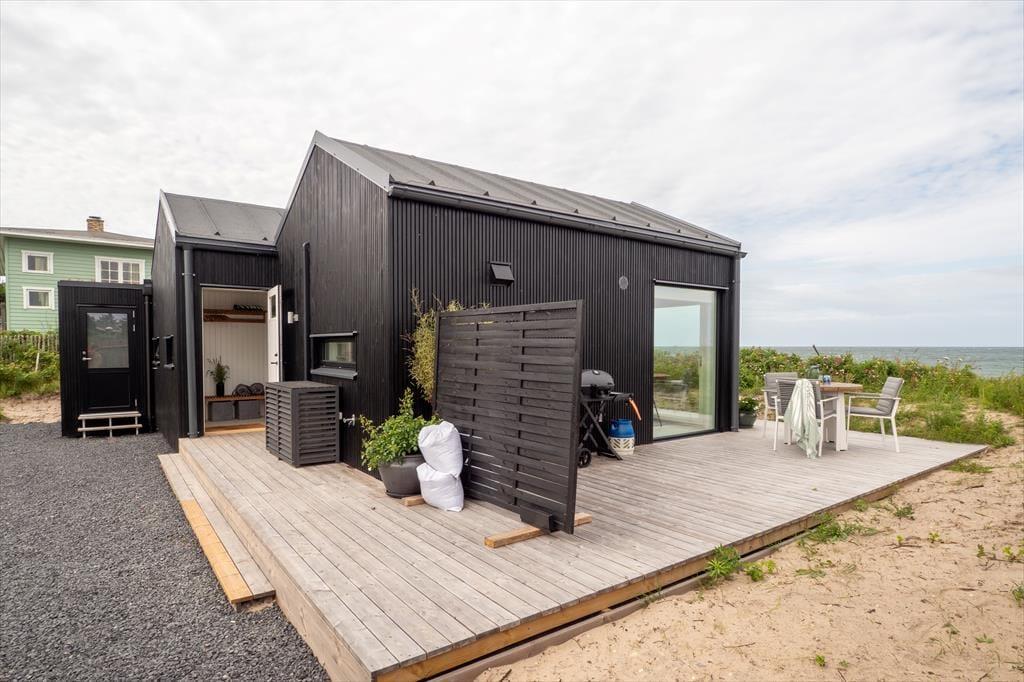 Det nyopførte sommerhus er gennemført til mindste detalje og indrettet med omtanke for både komfort og æstetik. Her er plads til to voksne og to børn – enten fordelt på soveværelset og hemsen eller med ekstra opredning på sovesofaen i stuen. Rummene er lyse, funktionelle og udnyttet optimalt, og overalt fornemmer man, at huset er skabt til ferie. Det moderne køkken ligger i åben forbindelse med spiseplads og opholdsstue, og selvom huset ikke er stort, mærkes det ikke – for overalt inviterer vinduer og døre naturen indenfor. Det hele emmer af afslappet luksus og af tid til bare at være.