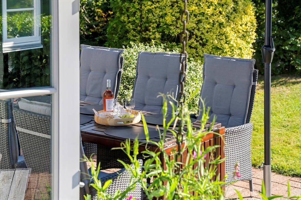 Et hyggeligt sommerhus, hvor feriestemningen både ude og inde er tydelig. Stuen er åben og indbydende, forbundet til køkkenet. Her kan du slappe af foran og nyde det skønne lysindfald fra haven. Hvad med at samle familien til et brætspil eller et godt måltid? Fra stuen er der direkte adgang til den hyggelige udestue, som forlænger sommermånederne. Sommerhuset rummer desuden tre gode værelser og et fint badeværelse.