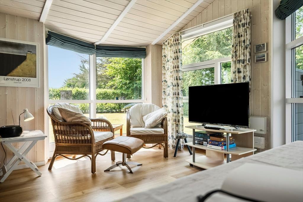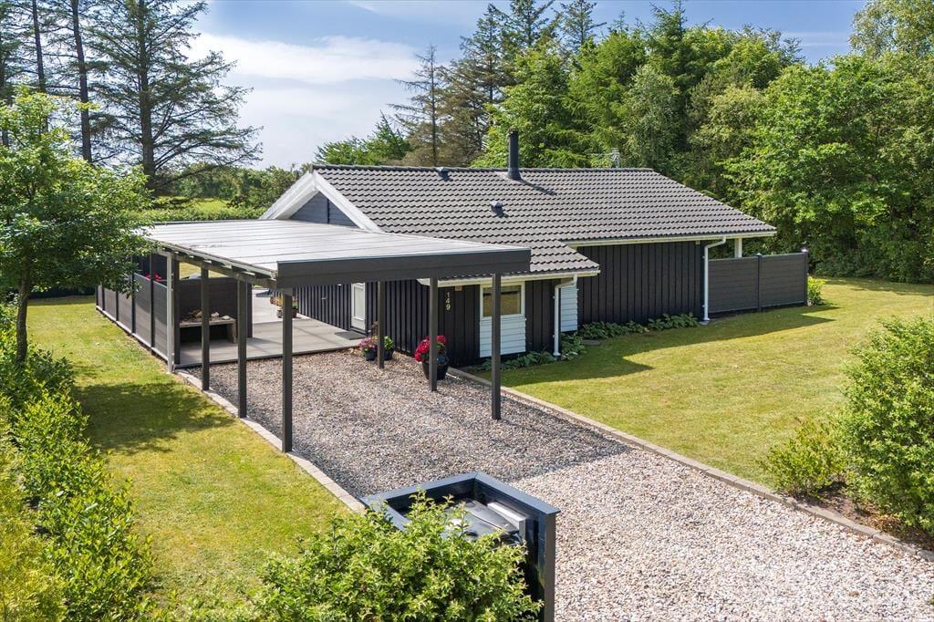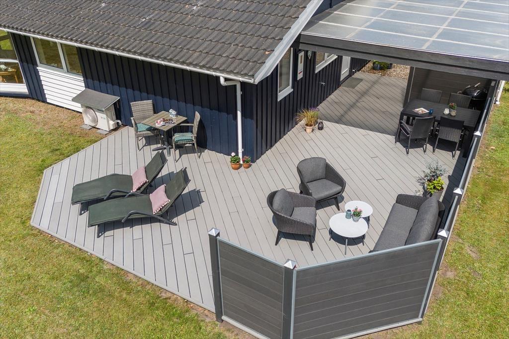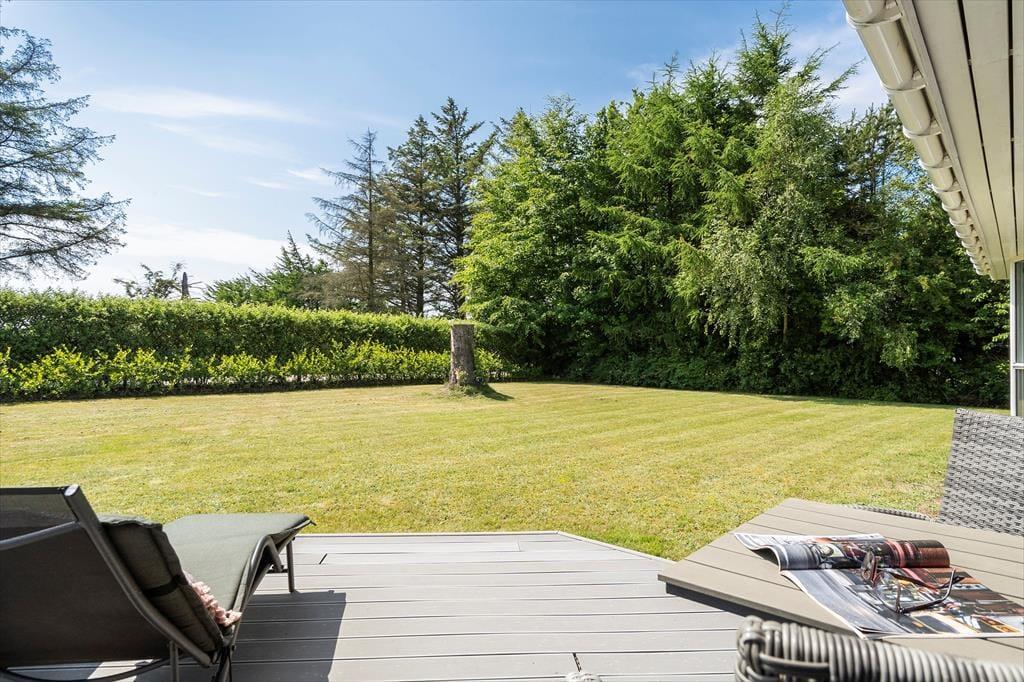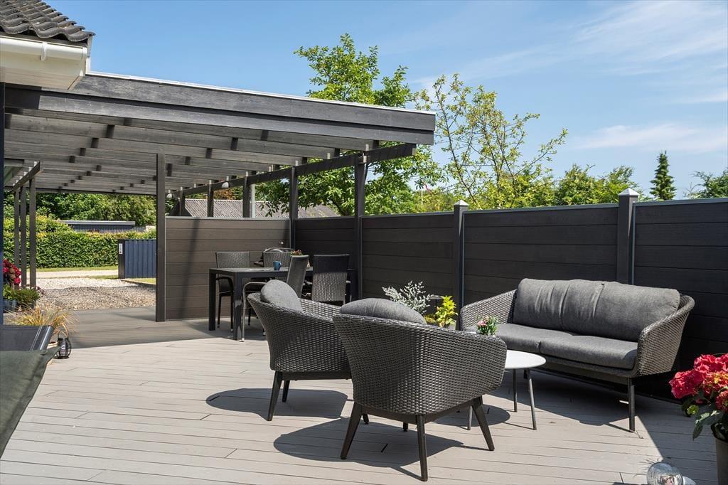 Tag fodbolden med ud og nyd en sjov familiedyst på græsplænen. Den høje hæk omkring haven giver jer mulighed for at være udendørs i fredelige og ugenerte omgivelser. Omkring huset finder I en stor, lukket og delvist overdækket terrasse med flere hyggekroge og havemøbler, hvor I kan slappe af i solen eller nyde de stille, regnfulde dage. Tænd op i grillen på den vestvendte træterrasse, og nyd et lækkert sommermåltid med udsigt til horisonten og aftenhimlens farvespil.