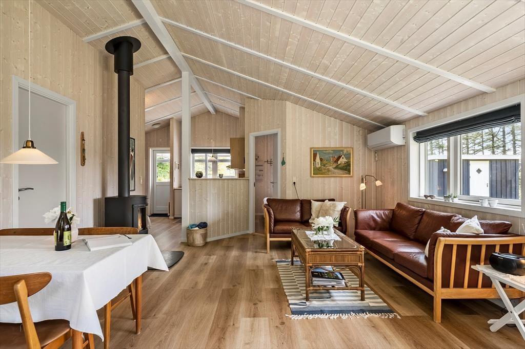 Når I træder ind i denne indbydende stue, bliver I mødt af et fantastisk lysindfald, og jeres øjne vil straks drages mod de store vinduer, hvor lyset strømmer ind og skaber en varm og behagelig atmosfære. Tag plads ved de charmerende møbler, der indbyder til mange hyggelige stunder – hvad enten det er omkring sofabordet med et spil kort eller ved spisebordet med et godt glas vin og samtaler om morgendagens planer, mens brændeovnen spreder varme og hyggelige knitrelyde. Det dejlige køkken lægger op til spændende kulinariske oplevelser, og da det er åbent mod både stue og spisestue, skaber det en skøn ramme for samvær og fællesskab.