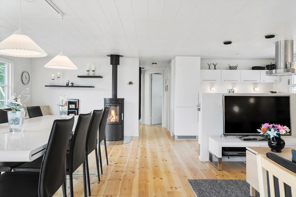 Dette særdeles flotte og velholdte sommerhus byder jer velkommen til en afslappende og rolig ferie i det vestjyske, her kan I trække stikket og kommet helt ned i gear, smid jer i de dejlige sofaer og nyd brændeovnens dejlige varme og hyggelige knitrende lyd der spreder sig i hele huset, og imens I får slappet godt af kan I nemt snakke med dem der laver mad i køkkenet eller spiller kort om spisebordet, for stuen ligger nemlig i åben forbindelse med både spiseafdeling og køkken, så her kan I virkelig for nydt hinandens samvær. Trænger I på et tidspunkt til at trække jer tilbage og nyde en stille stund for jer selv er værelserne i huset helt oplagte her kan I snuppe en velfortjent lur, læse en god bog eller nyde udsigten ud ad vinduerne.