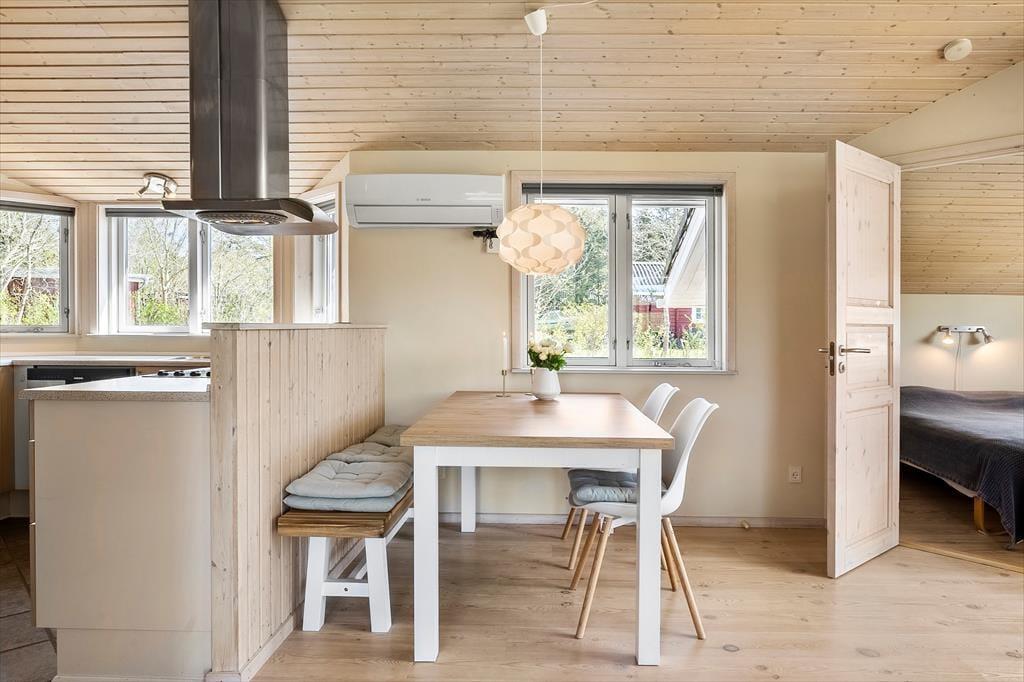 Udenfor venter en stor træterrasse, hvor I kan nyde solen dagen lang og spise måltider under åben himmel. Her er også et hyggeligt bålsted – oplagt til snobrød, stjernekig og gode snakke i skæret fra flammerne. Den omkringliggende natur er rolig og grøn, og fjorden ligger tæt på, så I nemt kan tage på en stille aftengåtur med udsigt over vandet. Her er der god plads til at trække vejret og bare være til.