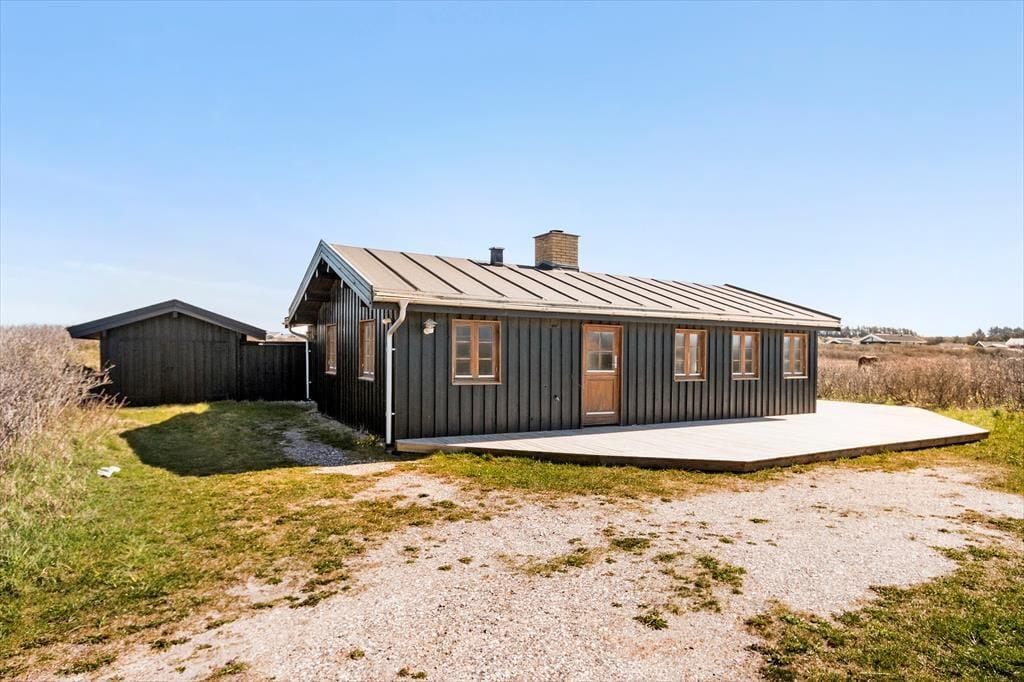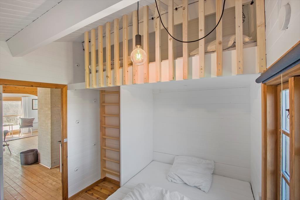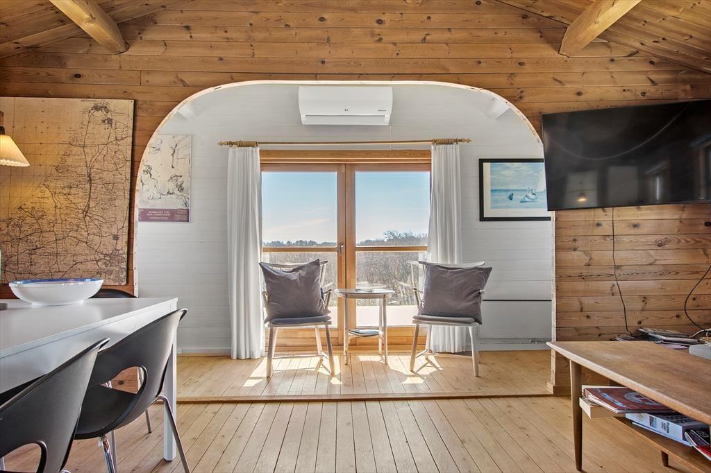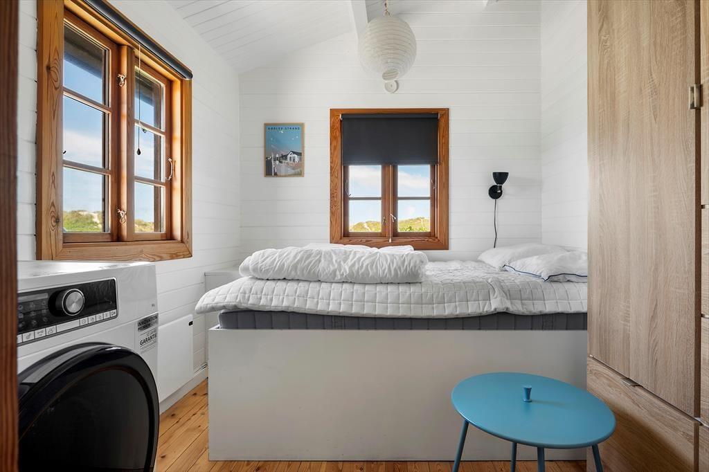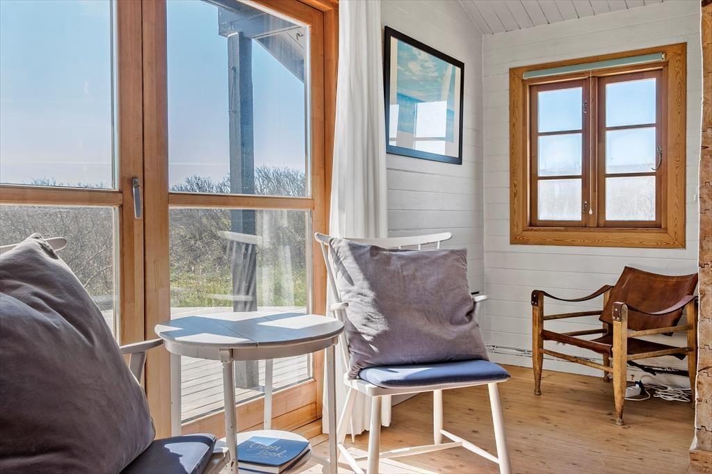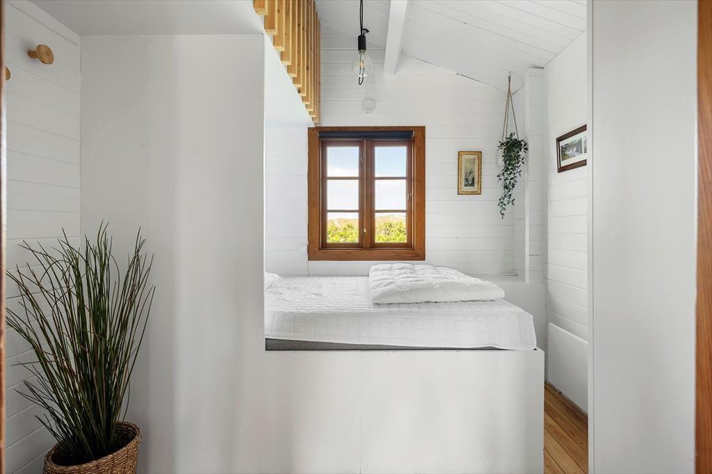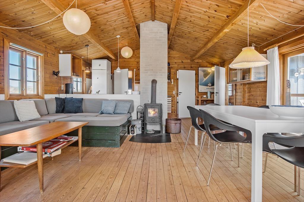 Inden døre i sommerhuset er der loft til kip og umalede trælister på væggene i flere rum, og sådan et rustikt look går godt i spænd med de naturskønne omgivelser. På velfungerende vis ligger stue og køkken i åben forbindelse, og her står der en brændeovn klar, hvis du får lyst til at skrue op for både temperaturen og hyggestemningen. I forlængelse af opholdsrummet ligger der en hvidmalet ”karnap”, og det et skønt sted at slå sig ned i en solstråle med en god bog – hvis ikke du i stedet lader tankerne vandre, mens du kigger ud på det kuperede klitlandskab. Sommerhusets hyggelige og hjemlige atmosfære kan også mærkes i de øvrige rum, der inkluderer tre gode soveværelser – hvoraf det ene har direkte adgang til en hems ved hjælp af en stige eller væghængte klatregreb.