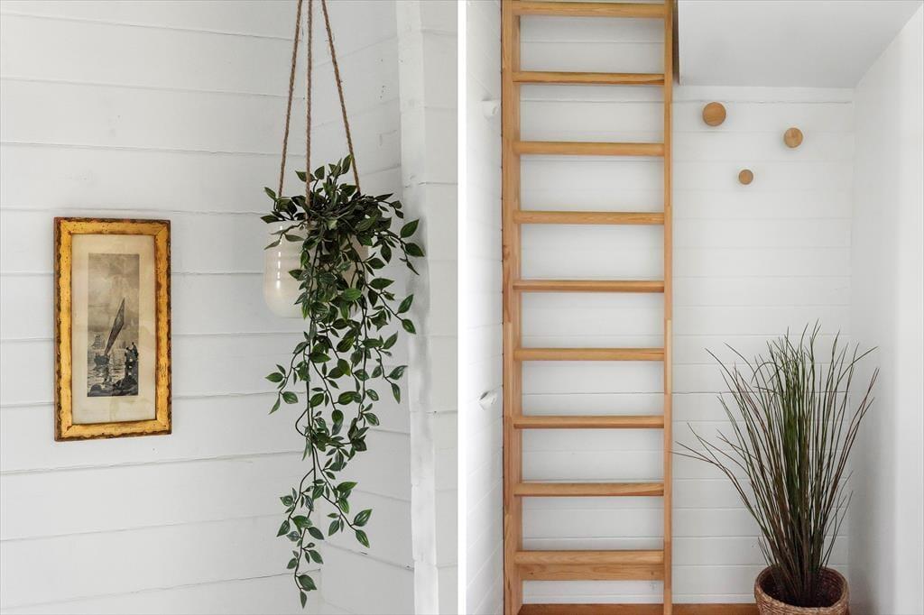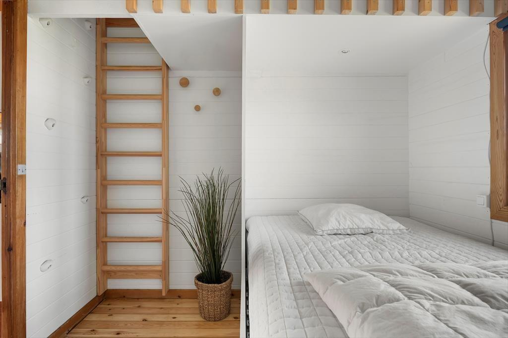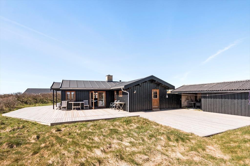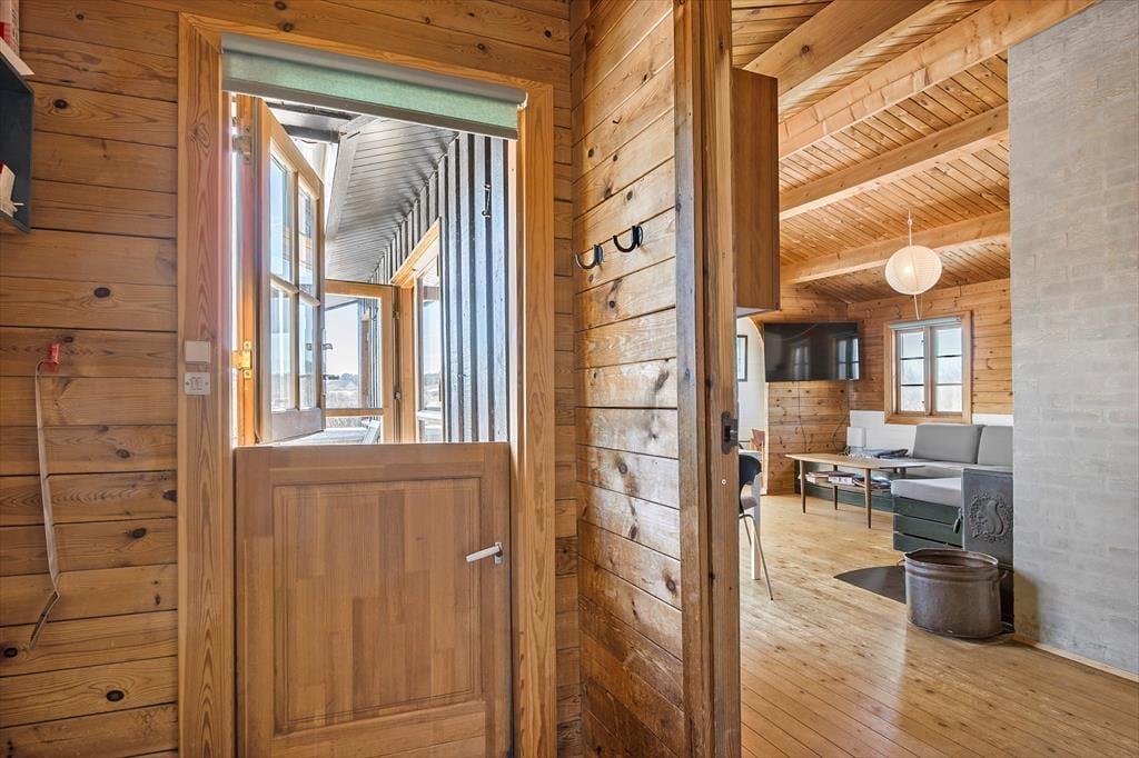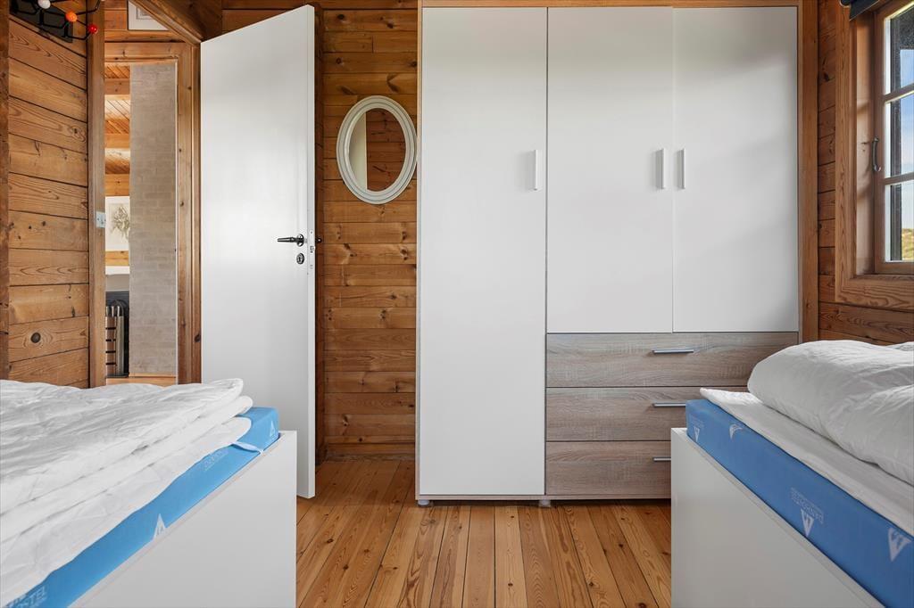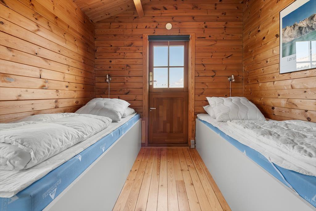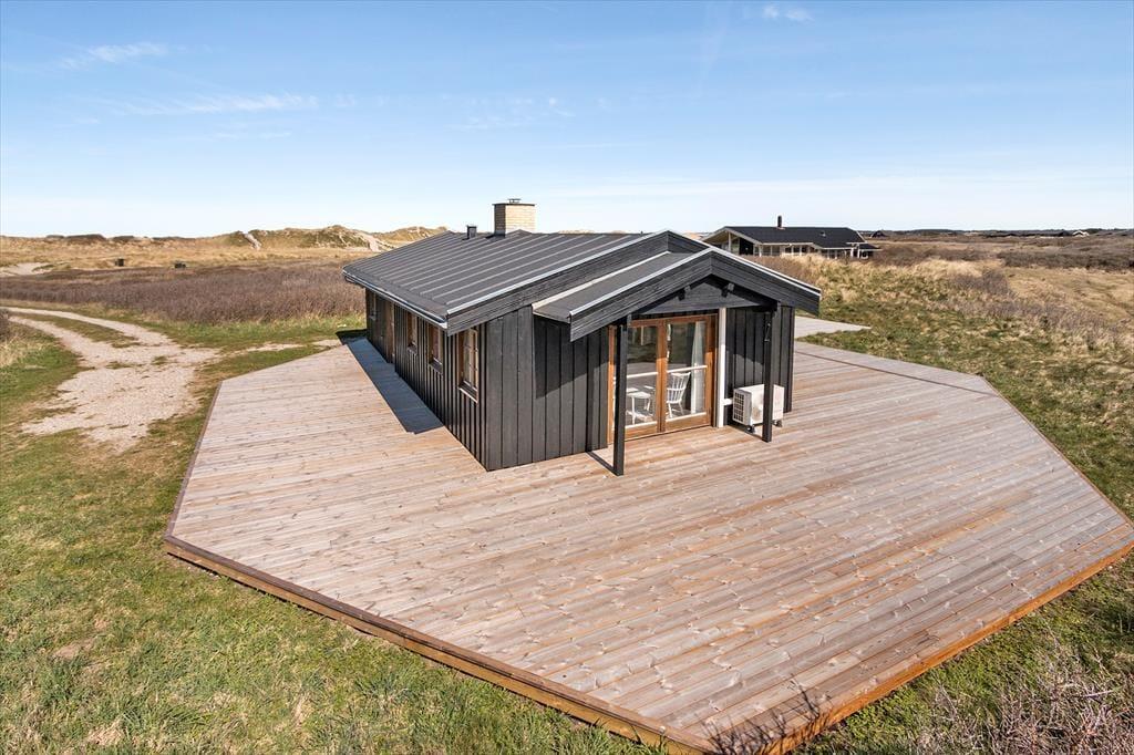 Inden døre i sommerhuset er der loft til kip og umalede trælister på væggene i flere rum, og sådan et rustikt look går godt i spænd med de naturskønne omgivelser. På velfungerende vis ligger stue og køkken i åben forbindelse, og her står der en brændeovn klar, hvis du får lyst til at skrue op for både temperaturen og hyggestemningen. I forlængelse af opholdsrummet ligger der en hvidmalet ”karnap”, og det et skønt sted at slå sig ned i en solstråle med en god bog – hvis ikke du i stedet lader tankerne vandre, mens du kigger ud på det kuperede klitlandskab. Sommerhusets hyggelige og hjemlige atmosfære kan også mærkes i de øvrige rum, der inkluderer tre gode soveværelser – hvoraf det ene har direkte adgang til en hems ved hjælp af en stige eller væghængte klatregreb.