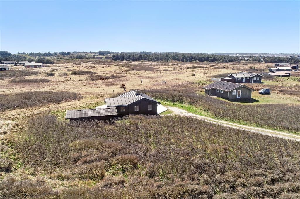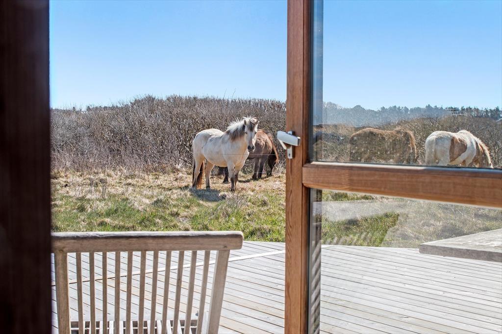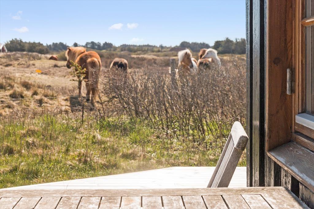 Det er bestemt ingen overdrivelse at skrive, at dette sommerhus har en særdeles naturskøn beliggenhed ved Nørlev Strand: Vesterhavet og den hvide sandstrand venter bare 100 meter væk, og som du kan se på billederne, går der ofte heste på græs i de lave klitter lige syd for sommerhuset. Med andre ord har du en smuk og fredfyldt ramme, når du nyder driverlivet her på Udemarken 24.