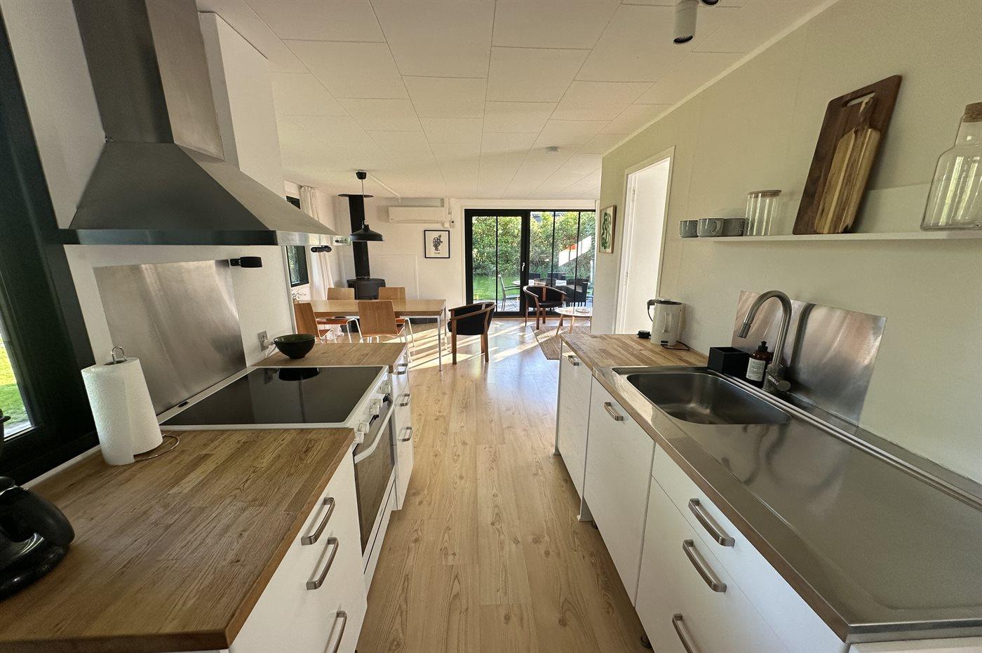 Køkkenet er udstyret med 1 køleskab. Der er 4 elkogeplader, bageovn, mikrobølgeovn samt opvaskemaskine.
