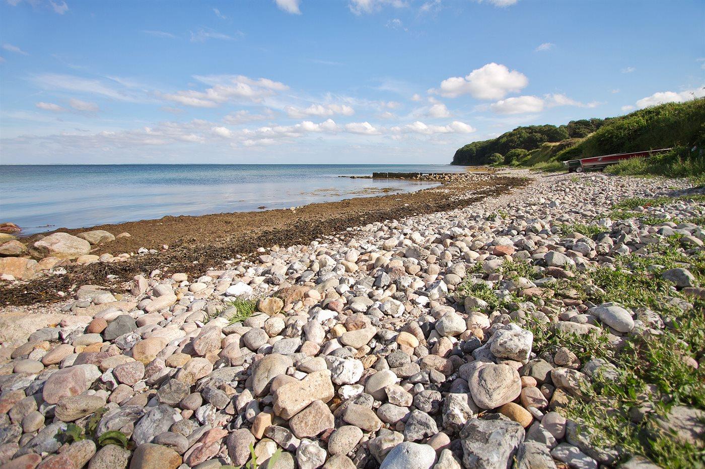 Et dejligt sommerhus, komplet renoveret i 2024, beliggende tæt ved vandet. Fra huset fører en trappe op til en terrasse, hvorfra der er udsigt over havet.