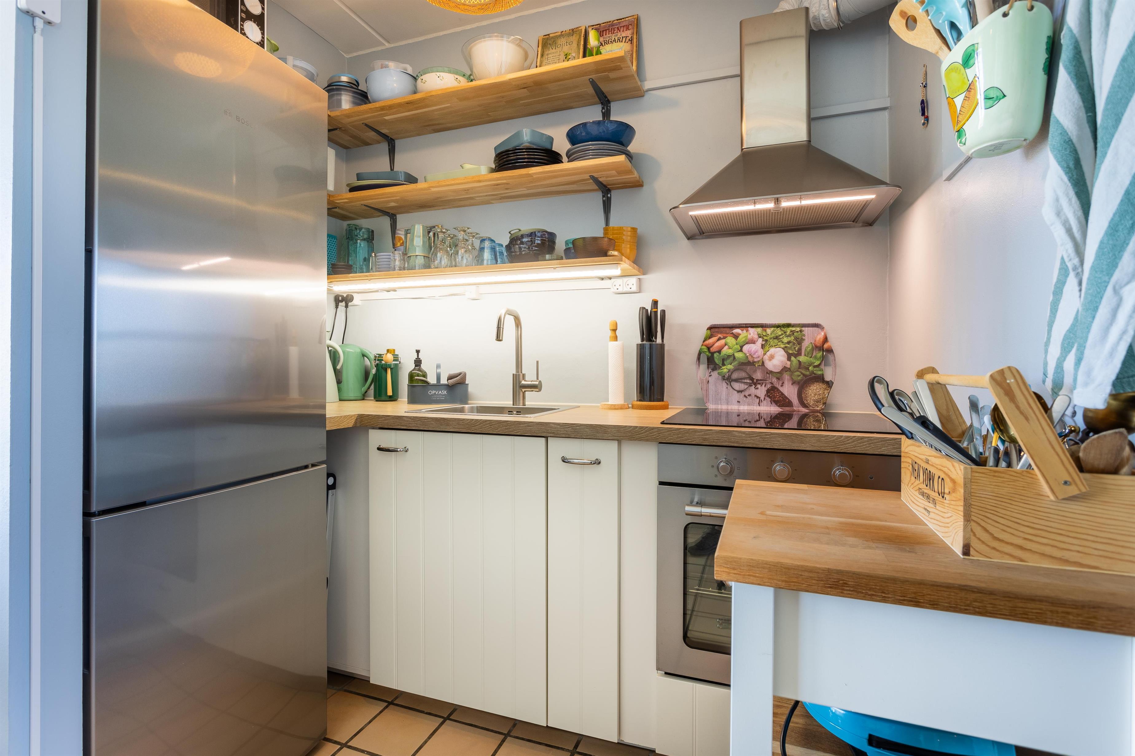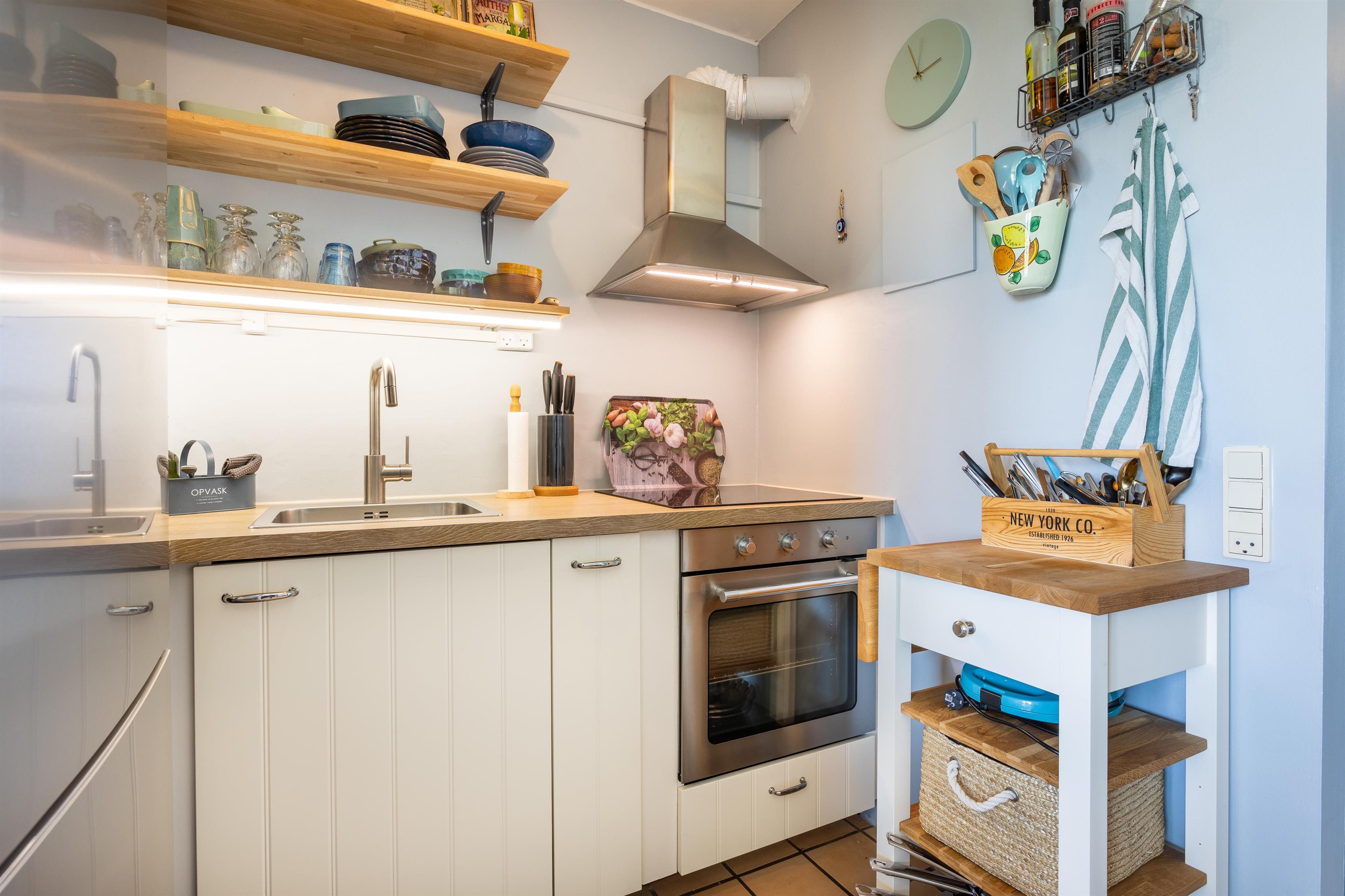 Selvom lejligheden er kompakt, er den indrettet med alt, hvad I behøver for en vellykket ferie. Her er et lille, velindrettet køkken med stort køleskab og fryser. Tag rullebordet med ind til spisebordet og skær jeres gøntsager her. Lejligheden er godt indrettet med et lille badeværelse med bruseniche og et godt soveværelse med dobbeltseng og god skabsplads. Lejligheden har desuden en varmepumpe, som sikrer et behageligt indeklima hele året rundt.