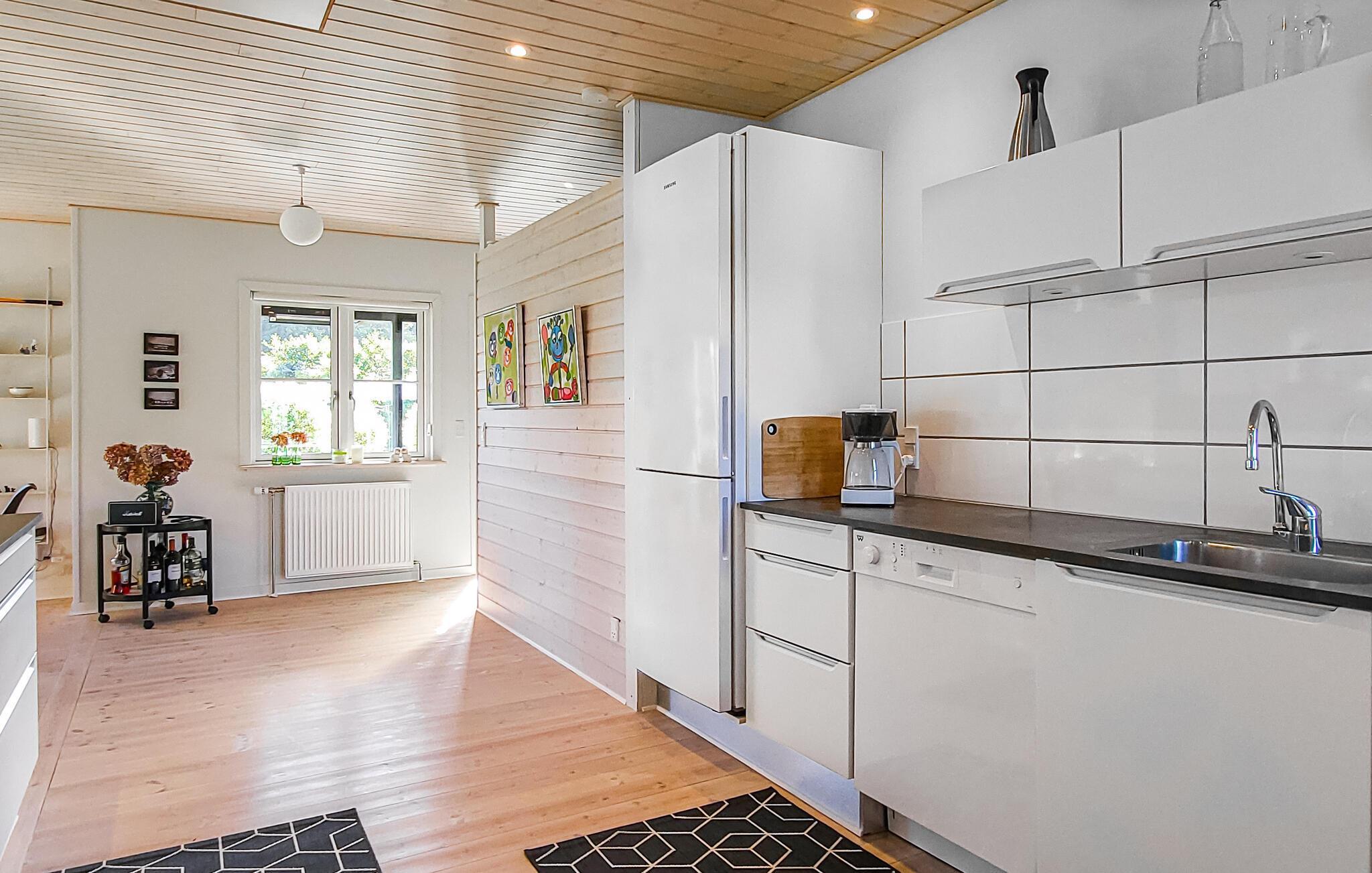 Lav god mad i det moderne køkken og nyd måltiderne ved spisebordet med udsigt til haven.