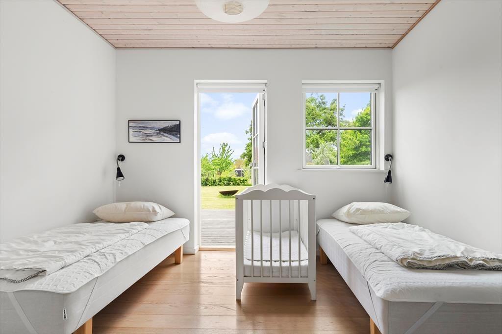 Efter en lang feriedag venter fire gode soveværelser – tre med to enkeltsenge og ét med dobbeltseng – så alle kan få en god nattesøvn. Med to badeværelser, vaskemaskine og tørretumbler er her også praktiske faciliteter, der gør ferien ekstra komfortabel.