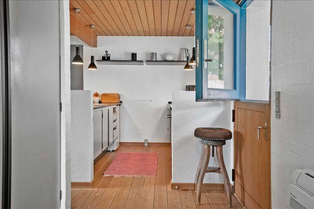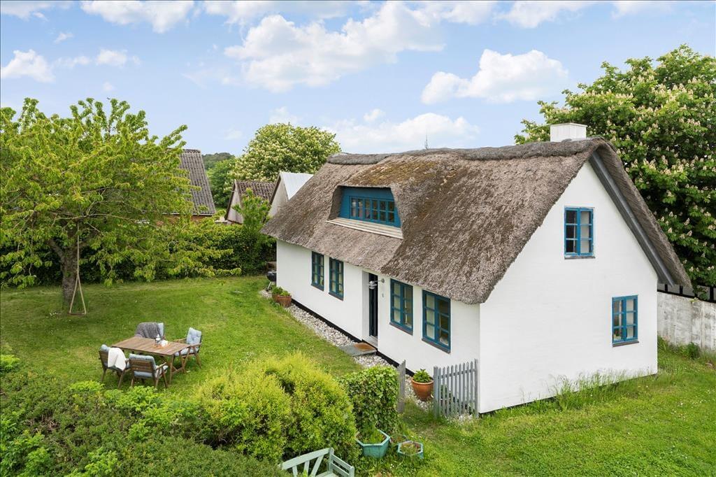 Huset er bygget i 1981 og kombinerer på smukkeste vis Nordbys oprindelige stråtage og sprossede vinduer med en mere nutidig indretning og komfort. I stueplan er der åben forbindelse mellem stue med brændeovn og alrum med velindrettet køkkenhjørne; trægulv i hele rummet og udgang til haven mod syd og nord. Bad med bruser og bryggers med tumbler og fryser. Også trægulve på 1. sal, som i gavlen mod øst er indrettet med et soverum med dobbelt boksmadras og skabe – og i gavlen mod vest med et delvist afskærmet sovehjørne med en dobbelt futonmadras.