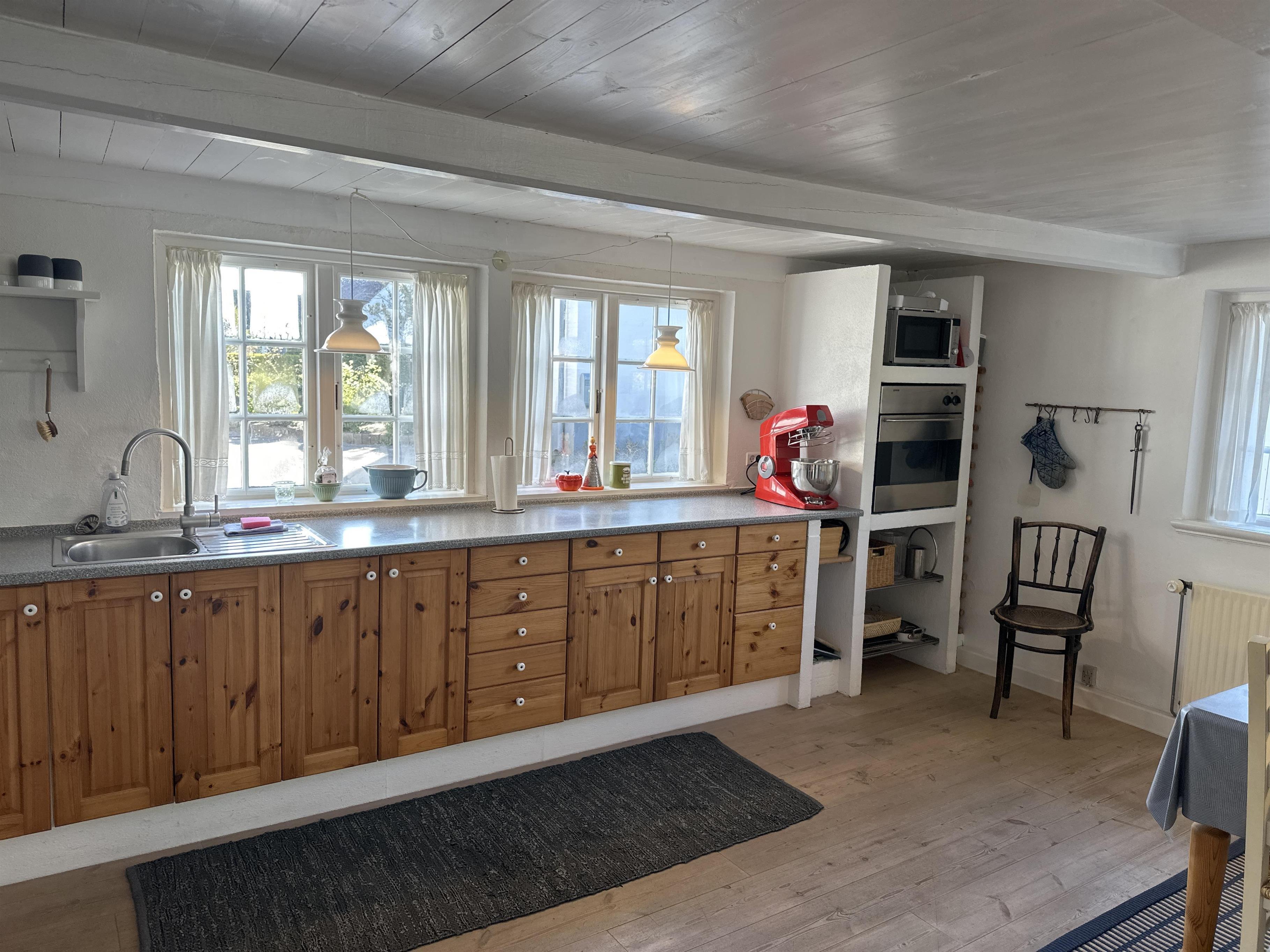 Når du træder indenfor, bliver du mødt af et dejligt, lyst køkkenalrum, hvor der både er plads til fælles madlavning, hyggelige måltider og afslapning foran brændeovnen i det indbydende sofahjørne. Her kan du nyde en rolig morgen med kaffe i hånden eller en afslappet aften efter en dag fuld af oplevelser på øen.