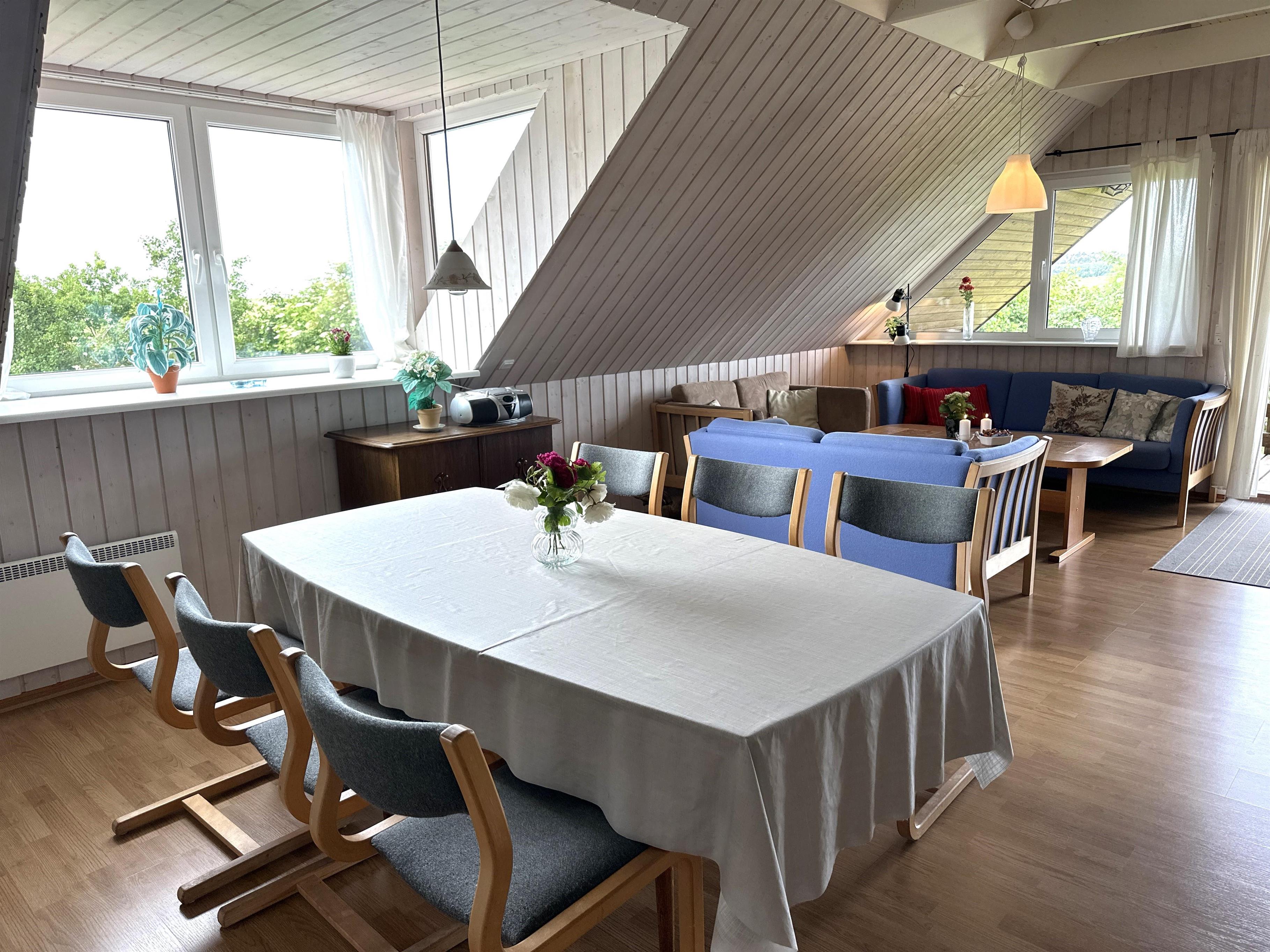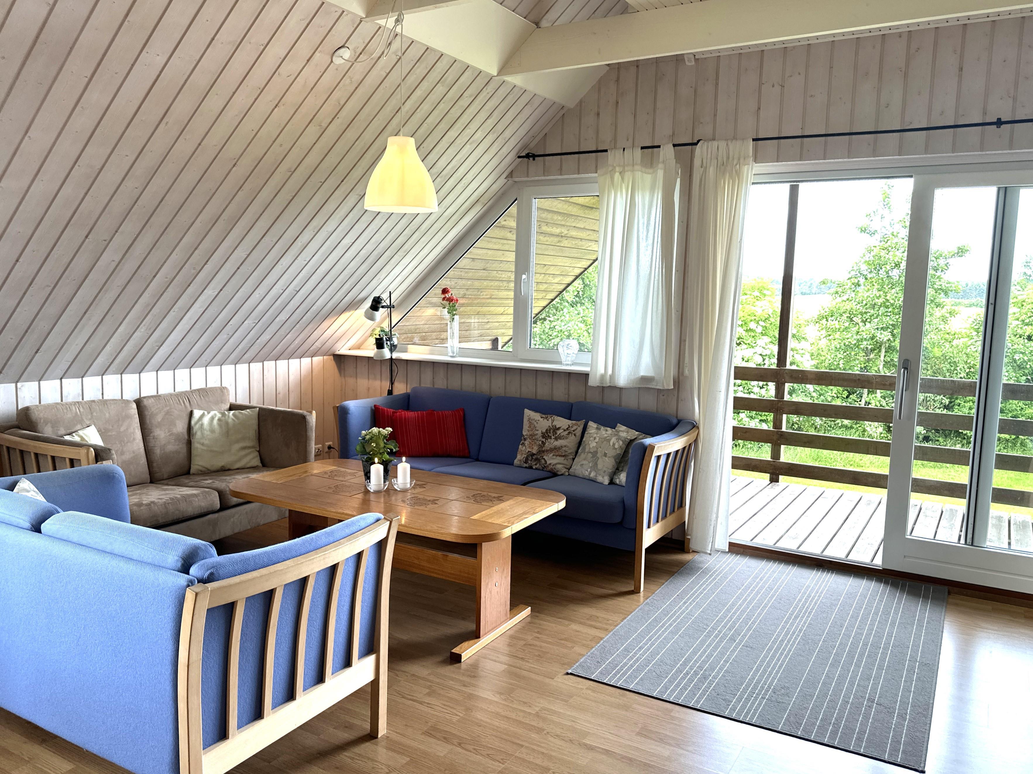 Lejligheden er lys og rummelig med store vinduer, der giver en smuk udsigt over de åbne marker og det omkringliggende landskab. Køkken-alrummet er indrettet med spiseplads og sofahjørne, hvor du kan nyde morgenkaffen, samles til hyggelige måltider eller slappe af med en god bog efter en dag med oplevelser.