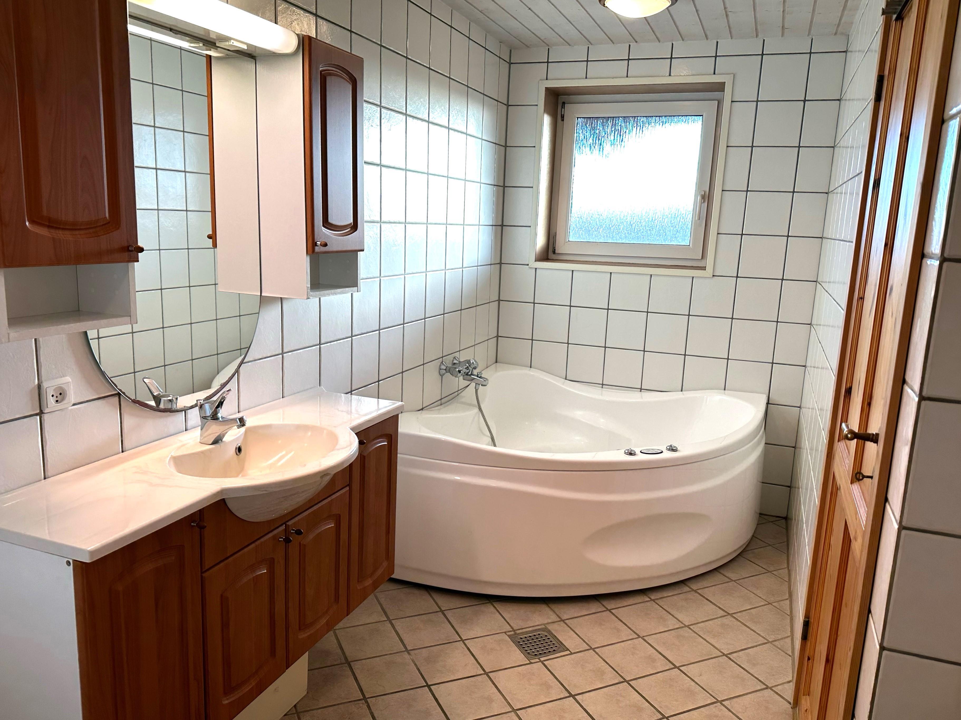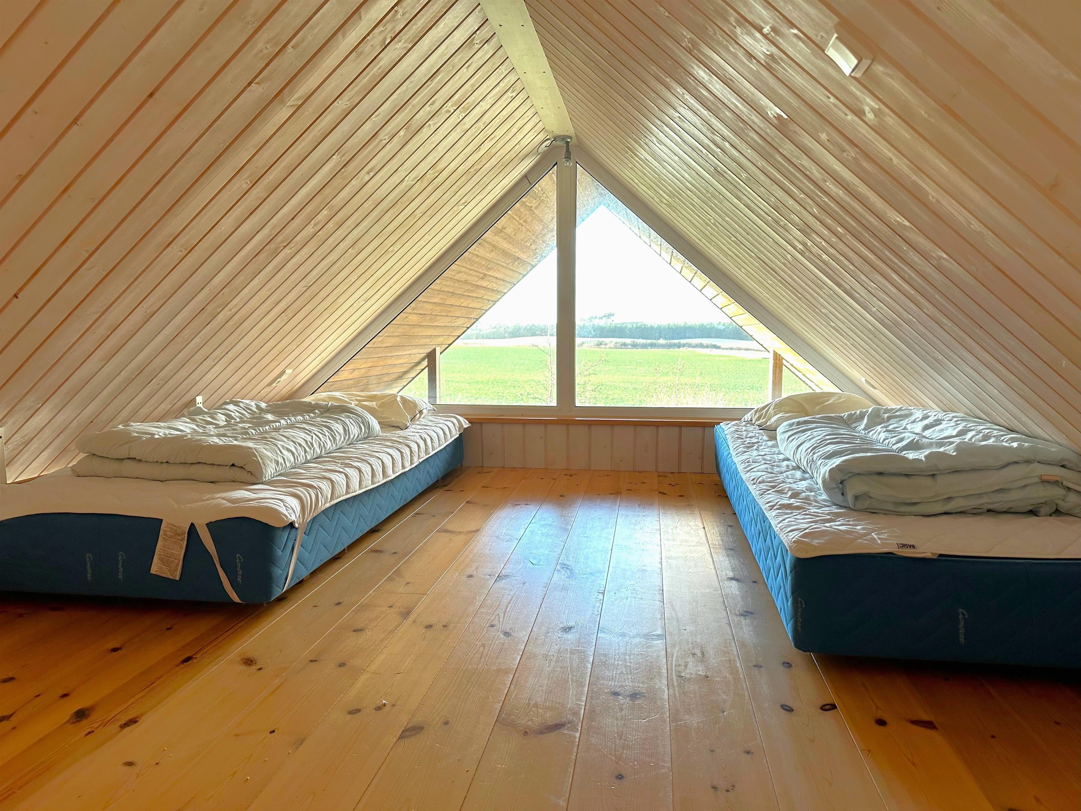 Der er to soveværelser, begge med komfortable dobbeltsenge, samt en hems, som giver ekstra sovepladser og plads til børn eller ekstra gæster. Badeværelset er udstyret med både brusekabine, spabad og sauna, så du kan forkæle dig selv og familien med afslapning og wellness under dit ophold.