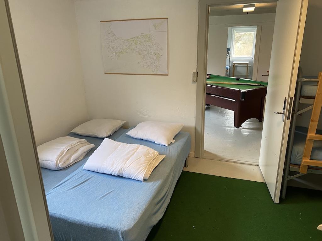 Dvs. der er 33 sengepladser (11 almindelige sengepladser og 22 køjesengepladser). Plus en gæsteseng til fri placering samt ekstra madrasser, der kan lægges på gulvet.
