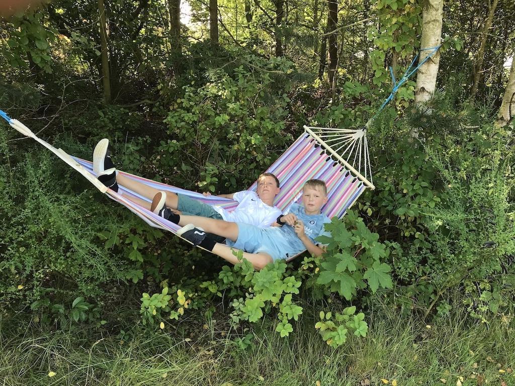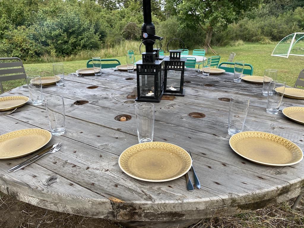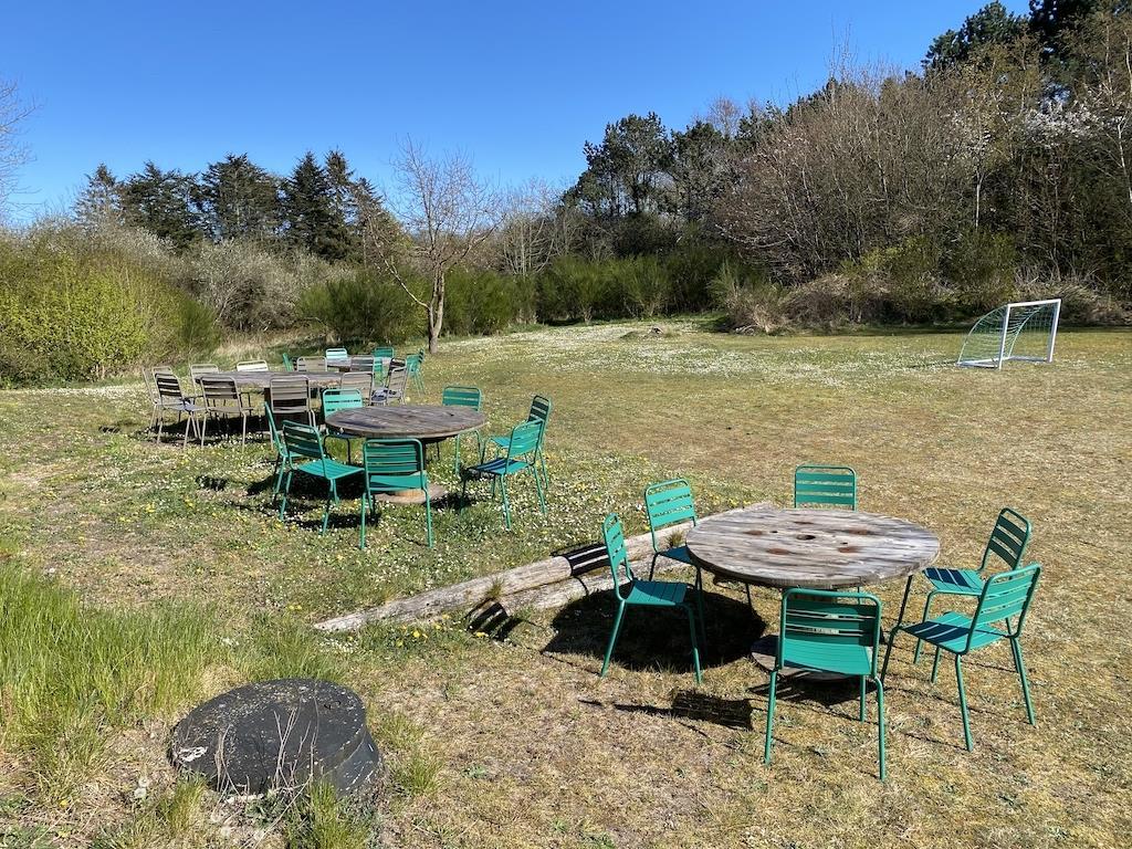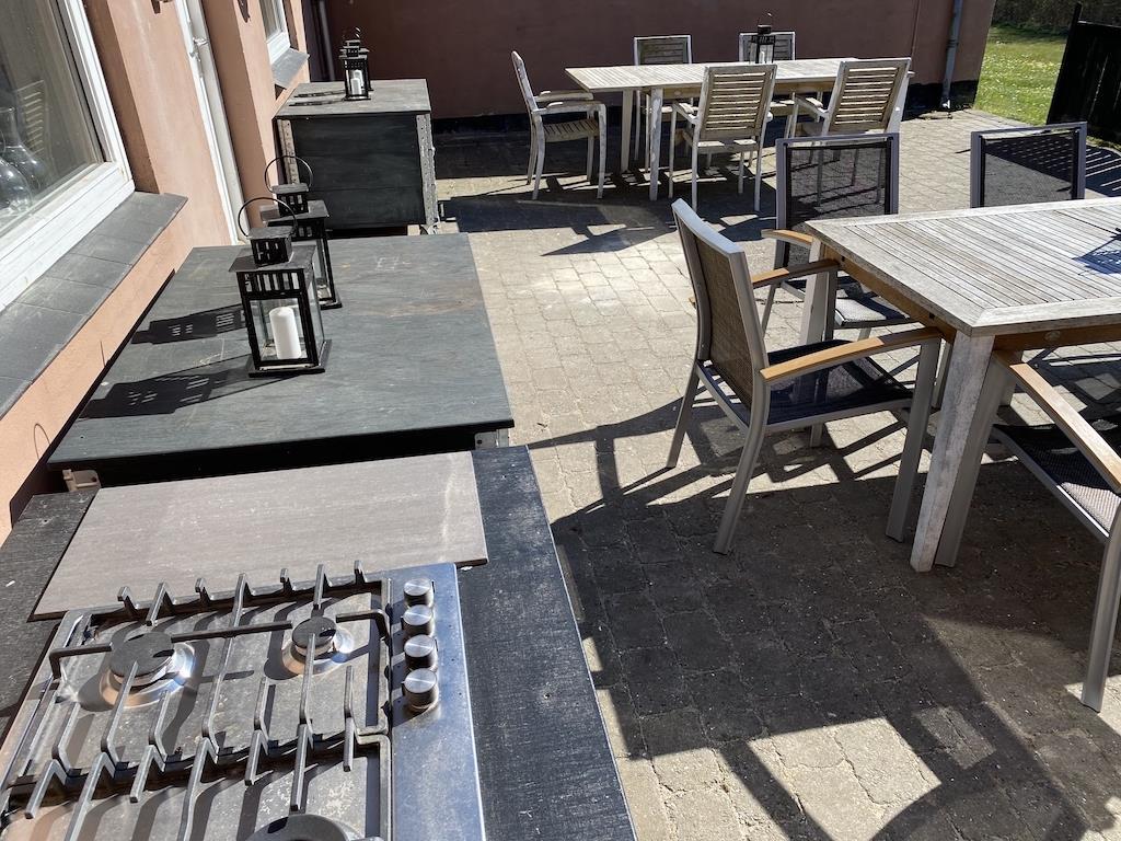 Huset har en skøn beliggenhed på en 7.740 m2 stor grund med både bålplads og boldbane. Der er en skøn, stor terrasse mod vest på 50 m2 med havemøbler og kulgrill og også en terrasse mod syd på 40 m2. Her er 43 stole og 3 store haveborde.
