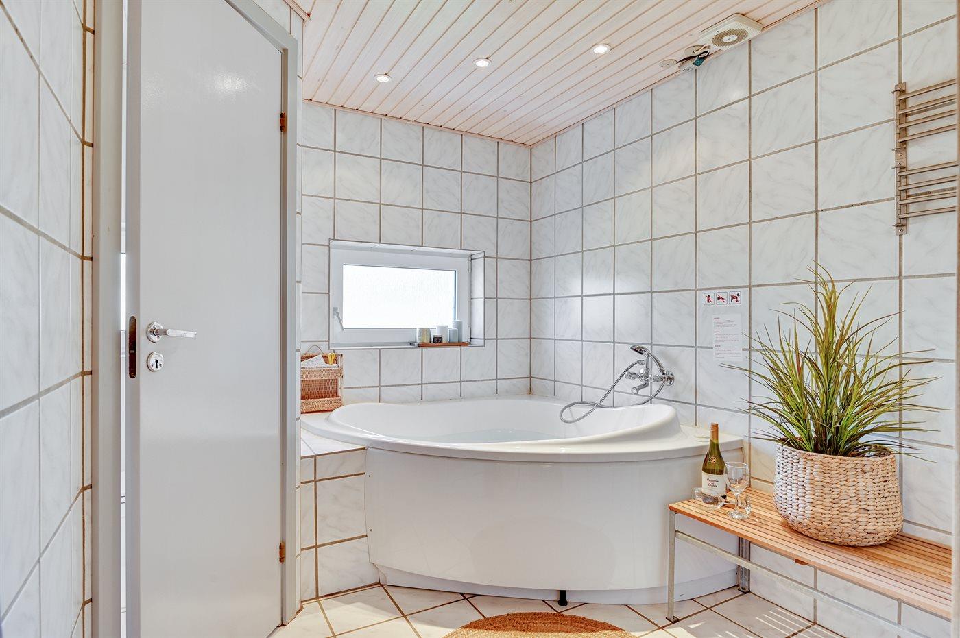 Der er 2 badeværelser med bruseniche og 2 toiletter. Der er gulvvarme på 2 badeværelser. I saunaen er der mulighed for afslapning.