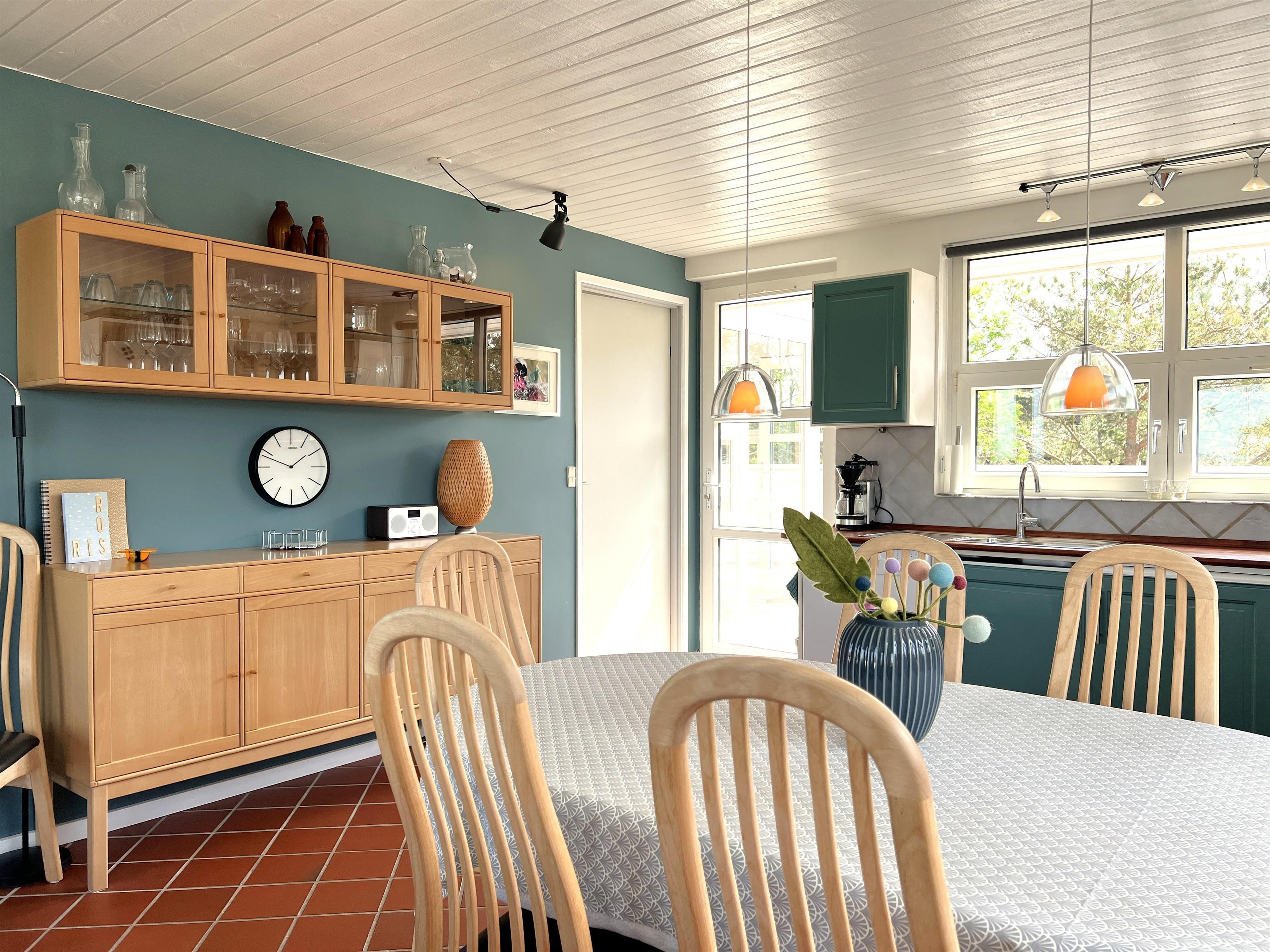 NYT hos Team Læsø. Et fantastisk dejligt, rummeligt sommerhus med en unik beliggenhed, der næppe findes bedre i Nordmarken. Der er en utrolig smuk panorama-havudsigt fra både huset, terrasserne og annekset, og bygningerne er placeret på en flot uberørt naturgrund, hvor hedelyngen dominerer. Der er ganske kort afstand mellem hovedhus og anneks, og man kan nemt bevæge sig mellem de to boliger. Hovedhuset fremstår lyst og indbydende, og de store vinduespartier giver et flot lysindfald. Fint og veludstyret køkken i åben forbindelse med spisestue. Huset har en dejlig stue med behagelige møbler, brændeovn og TV, og der er udgang til delvis overdækket træterrasse. Der er to store soveværelser med dobbeltsenge, hvoraf det ene har havudsigt og udgang til terrasse. Badeværelset med sauna og brus fremstår praktisk, flot og indbydende. Annekset 50 m2 byder, som hovedhuset, på fint lysindfald og havudsigt og har endnu et stort soveværelse med dobbeltseng og barneseng. Desuden et lækkert aktivitetsrum med flere forskellige spil - bordfodbold, dart, bobspil, bordcurling, div. kort/brætspil og bøger og en rigtig hyggelig bar, hvor ung, som gammel kan slukke tørsten. Huset har stærkt fibernet indlagt og er generelt meget veludstyret. Rundt huset er der flere dejlige solkroge og terrasser med havemøbler og solsenge til rådighed. Her kan husets grill også benyttes, mens man nyder den smukke solnedgang over havet. Sammen med udsigten, den smukke naturgrund og den fredfyldte beliggenhed, fornemmer man virkelig den særlige Læsøro.