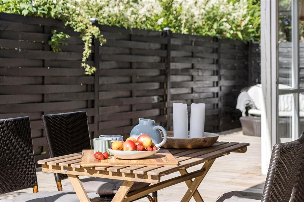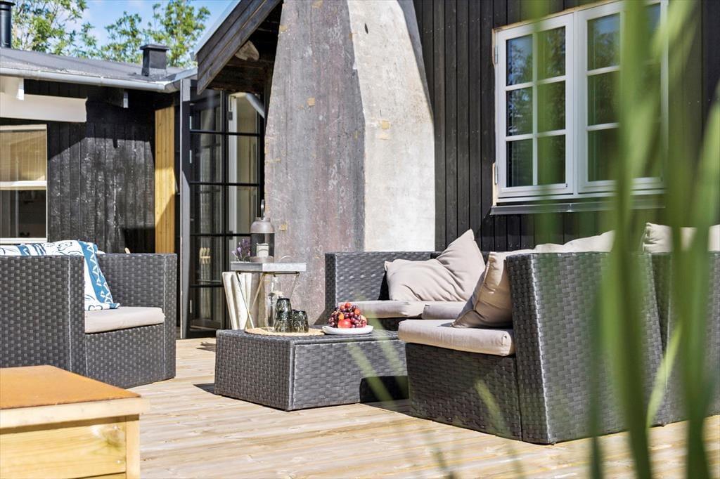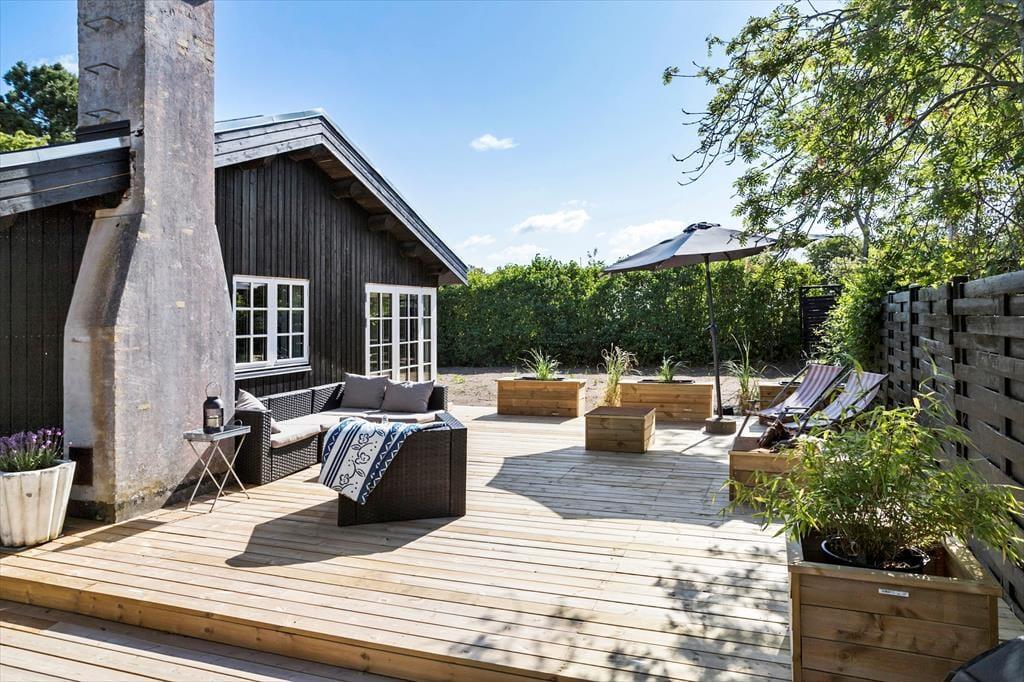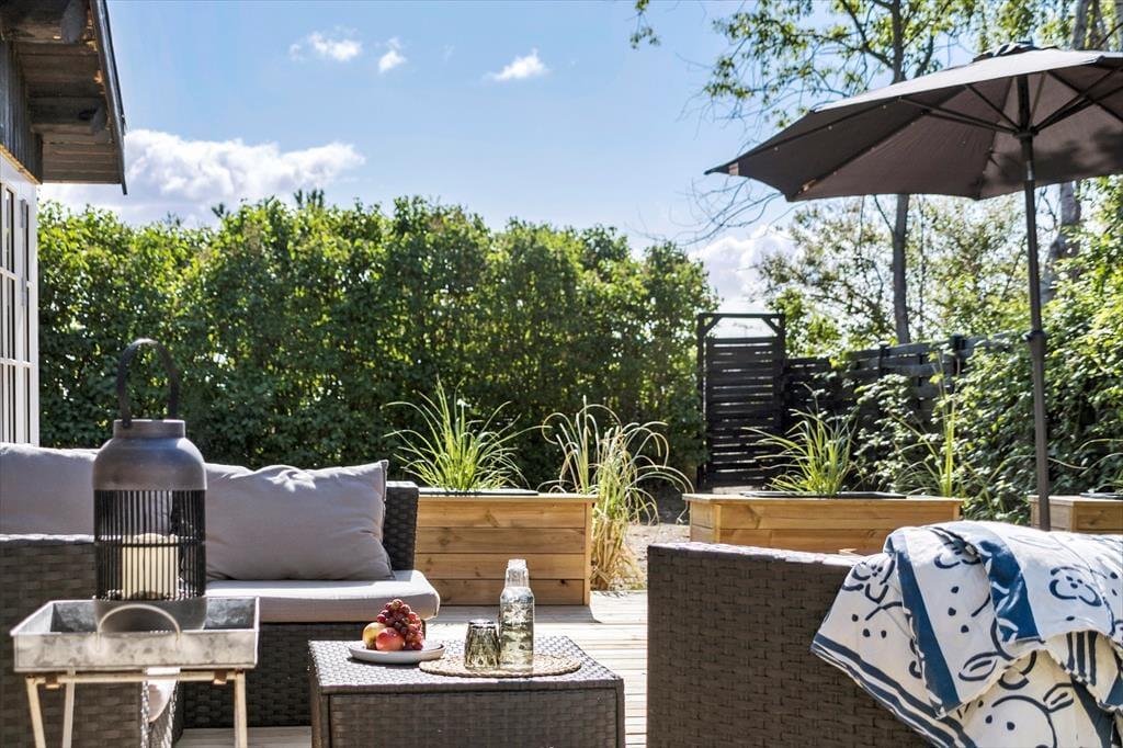 Sommerhuset har en stor træterrasse i to niveauer, der går rundt om husets syd- og vestside, så der er gode muligheder for at finde både læ og sol her. Fra køkkenet og udestuen er der udgang til en overdækket terrasse, hvor det er ideelt at nyde feriens måltider. På den store terrasse findes flere komfortable havemøbler som solstole og loungemøbler, så man kan let tilbringe mange timer på den store terrasse. Her er også nyanlagte krukker og plantekasser, der giver et grønt og levende miljø.