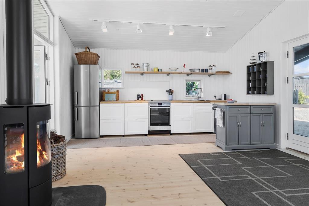 Herfra går man ind i husets køkkenalrum. Det åbne samlingsrum med køkken og spisebordsplads har loft til kip og en hyggelig hems med madrasser, hvor man kan kravle op og kigge ned eller slappe af lidt tilbagetrukket. De lyse trævægge og gulve er gennemgående i huset, hvilket er med til at gøre sommerhuset indbydende at holde ferie i.