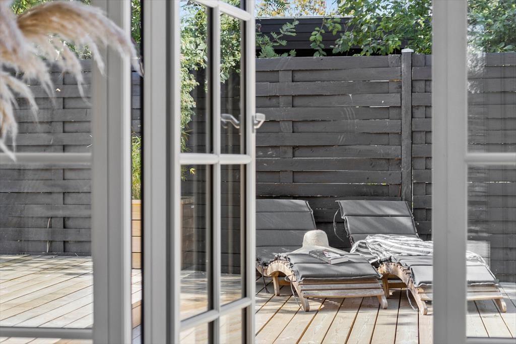 I stuens hjørne er der igen vinduer fra gulv til loft og udgang til terrassen, så man kan kigge ud på den fine terrasse og grønne have.