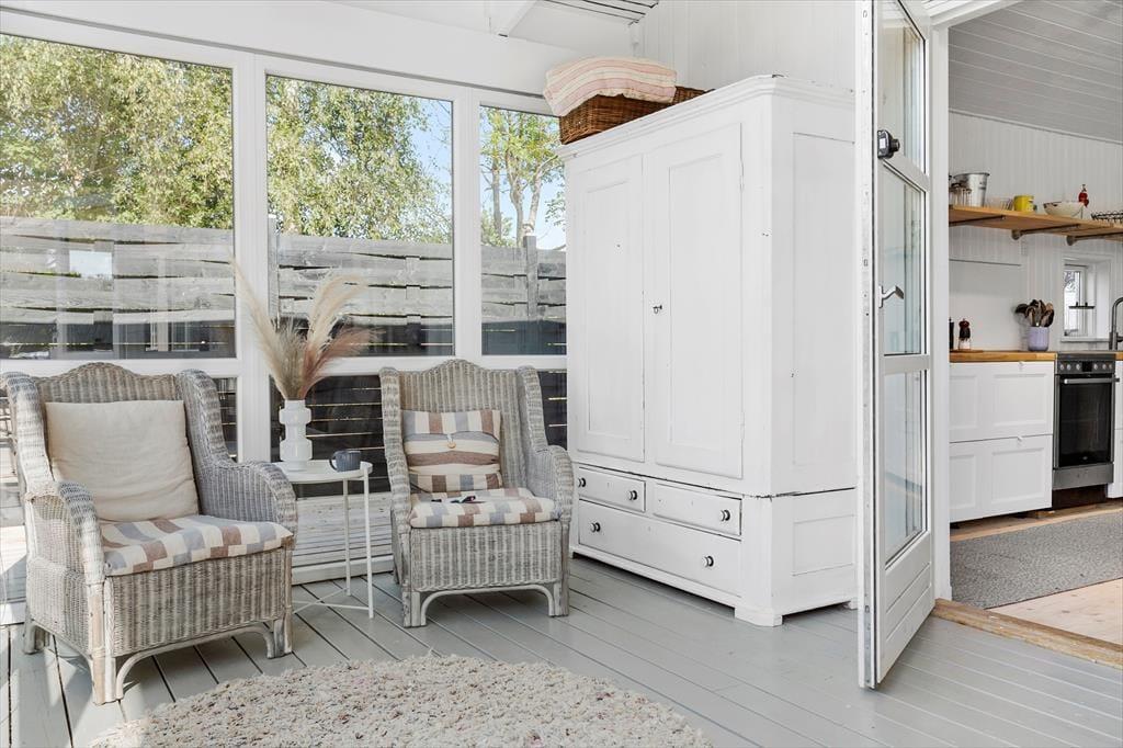 Sommerhuset emmer af hygge og en lys og afslappende sommerhusstil. Sommerhusets entré er også en gennemgang, der forbinder husets to afdelinger. Det er en flot og lys entré med døre til både syd- og nordsiden af huset. Det er et stilfuldt indrettet med opbevaringsplads og spejl.