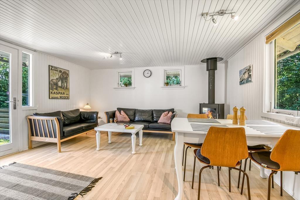 For enden af en stille grusvej, midt i det fredelige og naturskønne Fjand, ligger dette hyggelige sommerhus – et oplagt sted til afslapning, samvær og ferie i rolige omgivelser. Huset er lyst og indbydende med et åbent opholdsrum, hvor køkken, spiseplads og stue går ud i ét. Her kan I samles omkring måltiderne, spille spil og nyde varmen fra brændeovnen. I den anden ende af huset finder I en skøn spaafdeling med både sauna, bruser og spabad – lige til at synke ned i efter en dag i naturen.