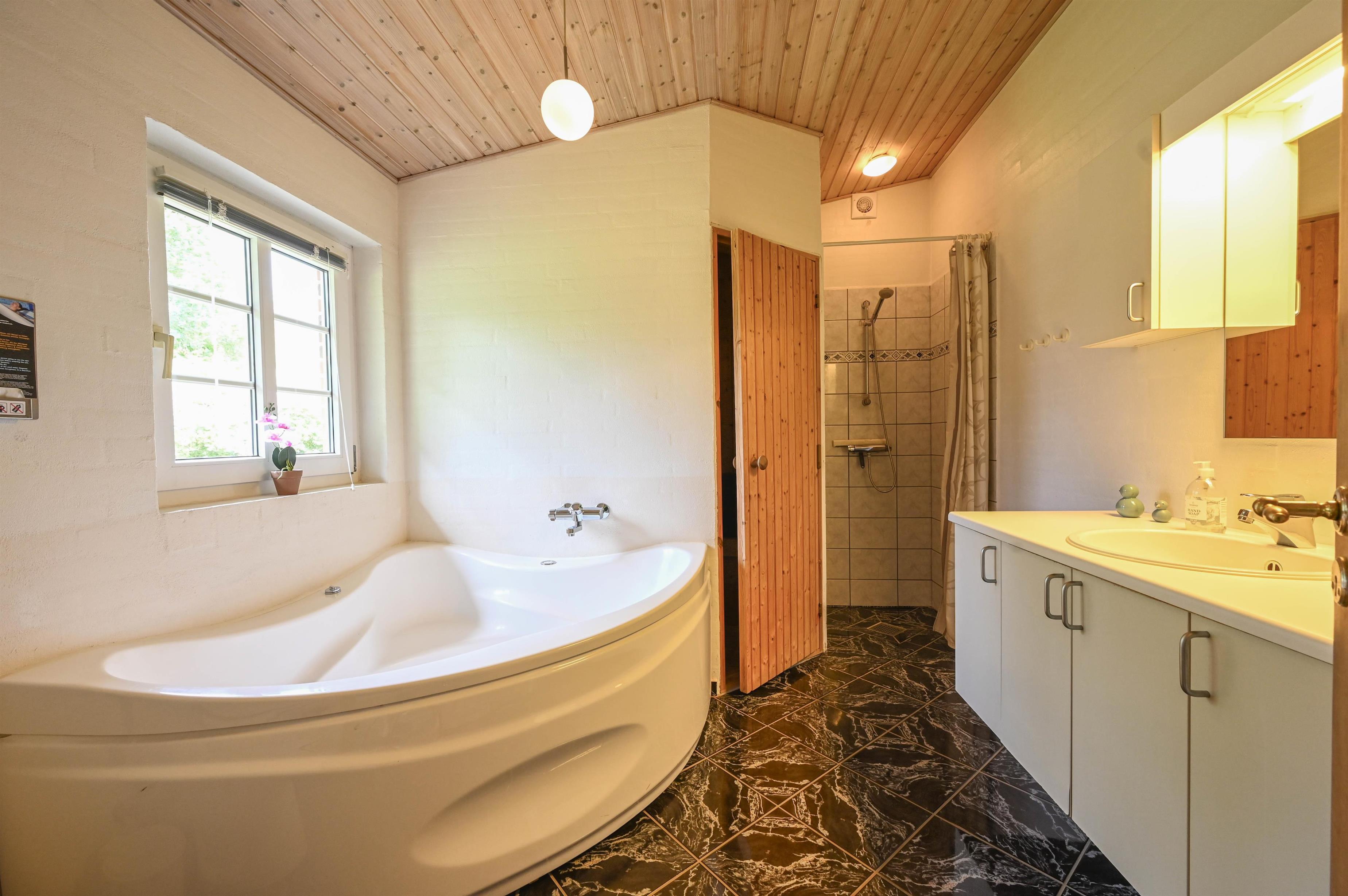 Det flotte badeværelse byder på både spabad og sauna, så du kan forkæle dig selv efter en lang dag i den friske fjordluft.
