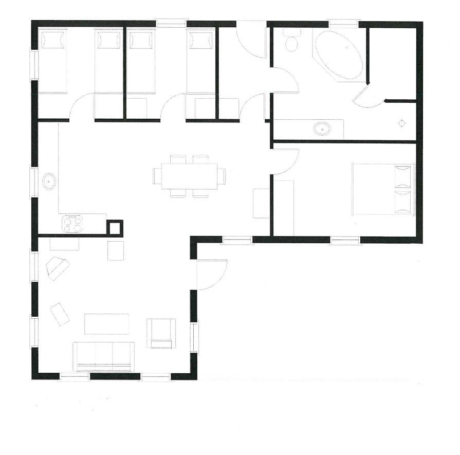 Der er et godt soveværelse med dobbeltseng samt to værelser med hver to enkeltsenge.