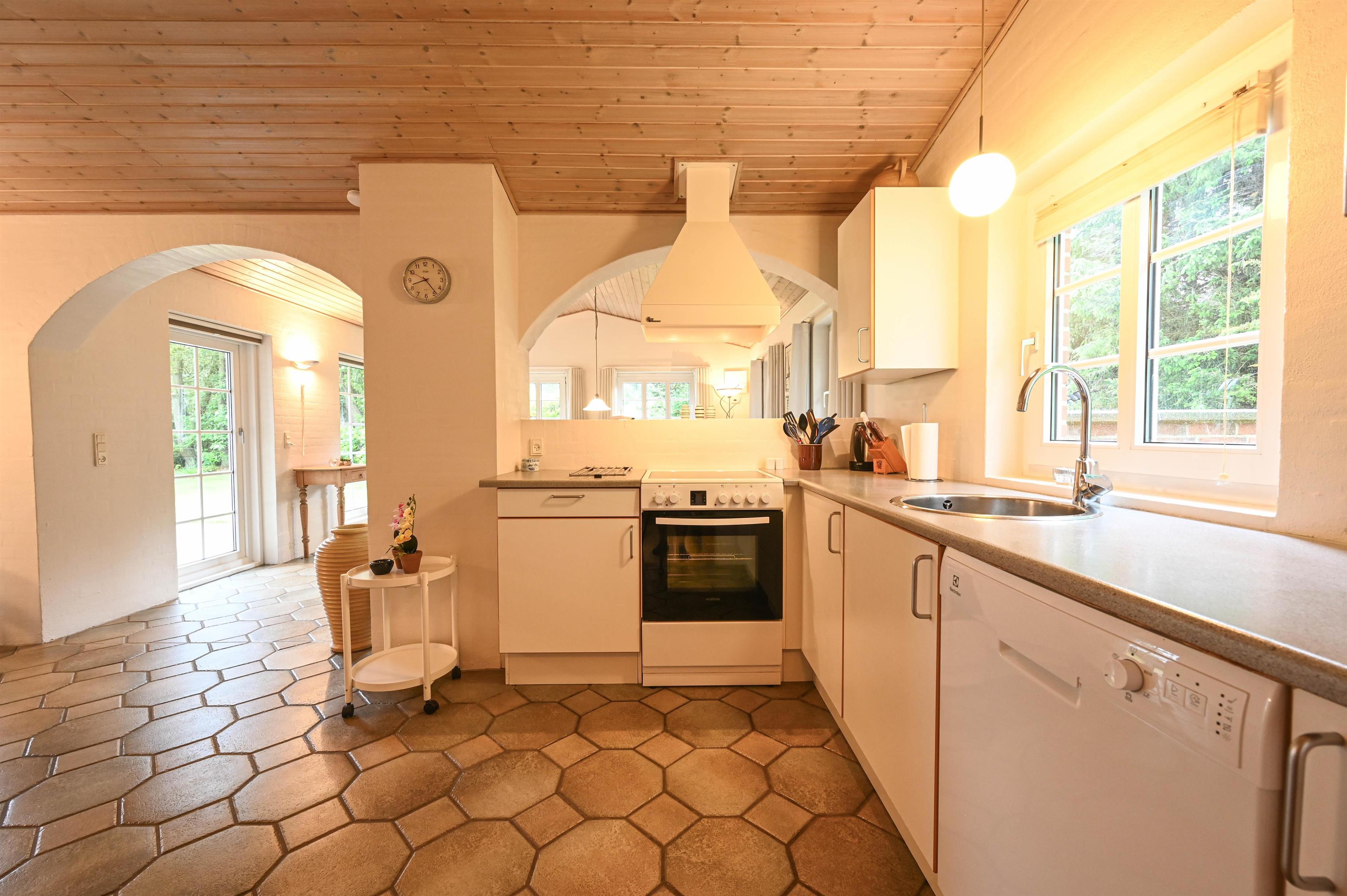 Det flotte og veludstyrede køkken har bl.a. opvaskemaskine og ligger i åben forbindelse med stuen, hvor du finder spiseplads, en komfortabel sofagruppe, brændeovn og udgang til terrassen, hvorfra der er et lille glimt af fjorden.
