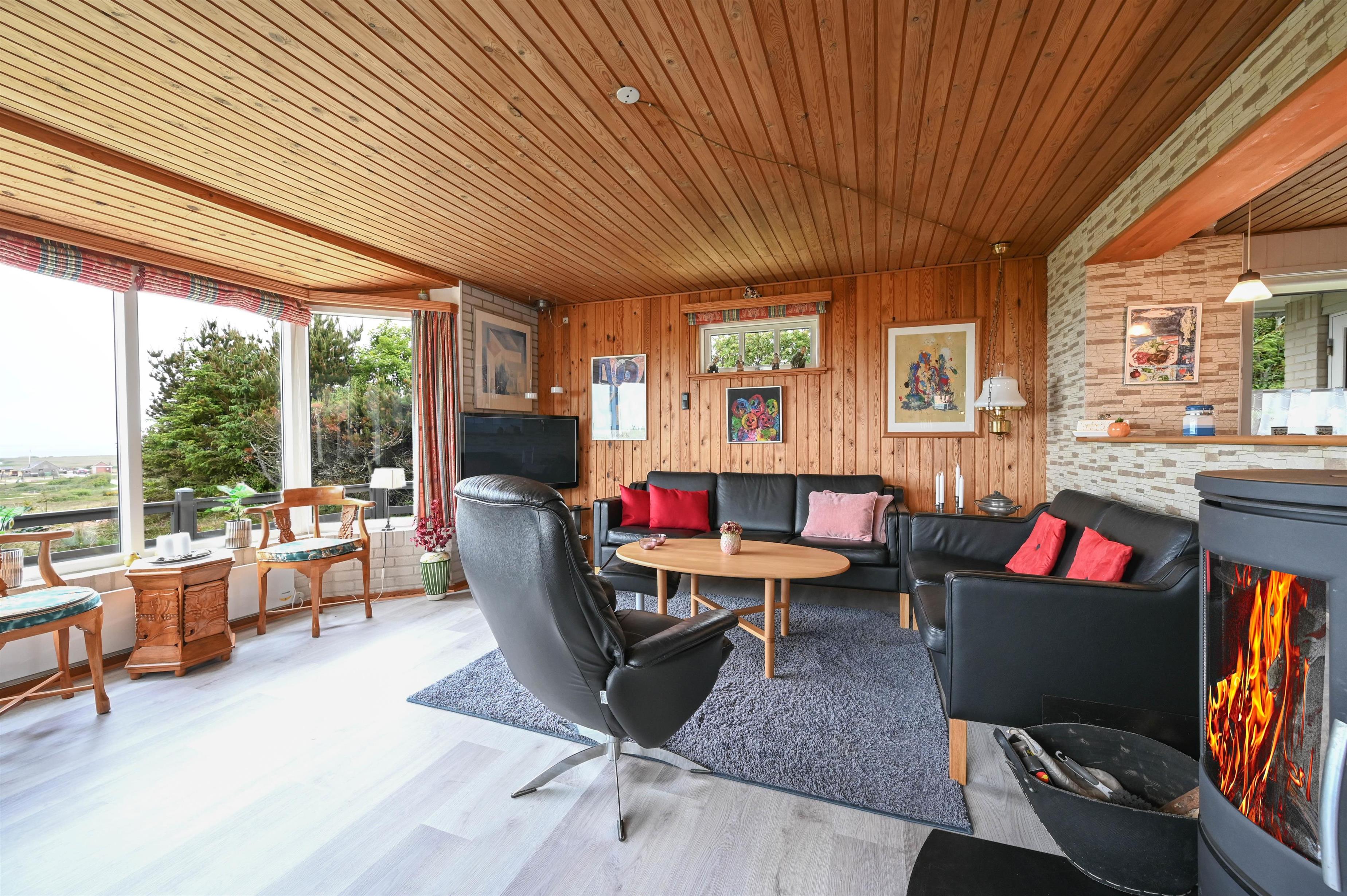 Stue med brændeovn og panoramavinduer mod fjorden
