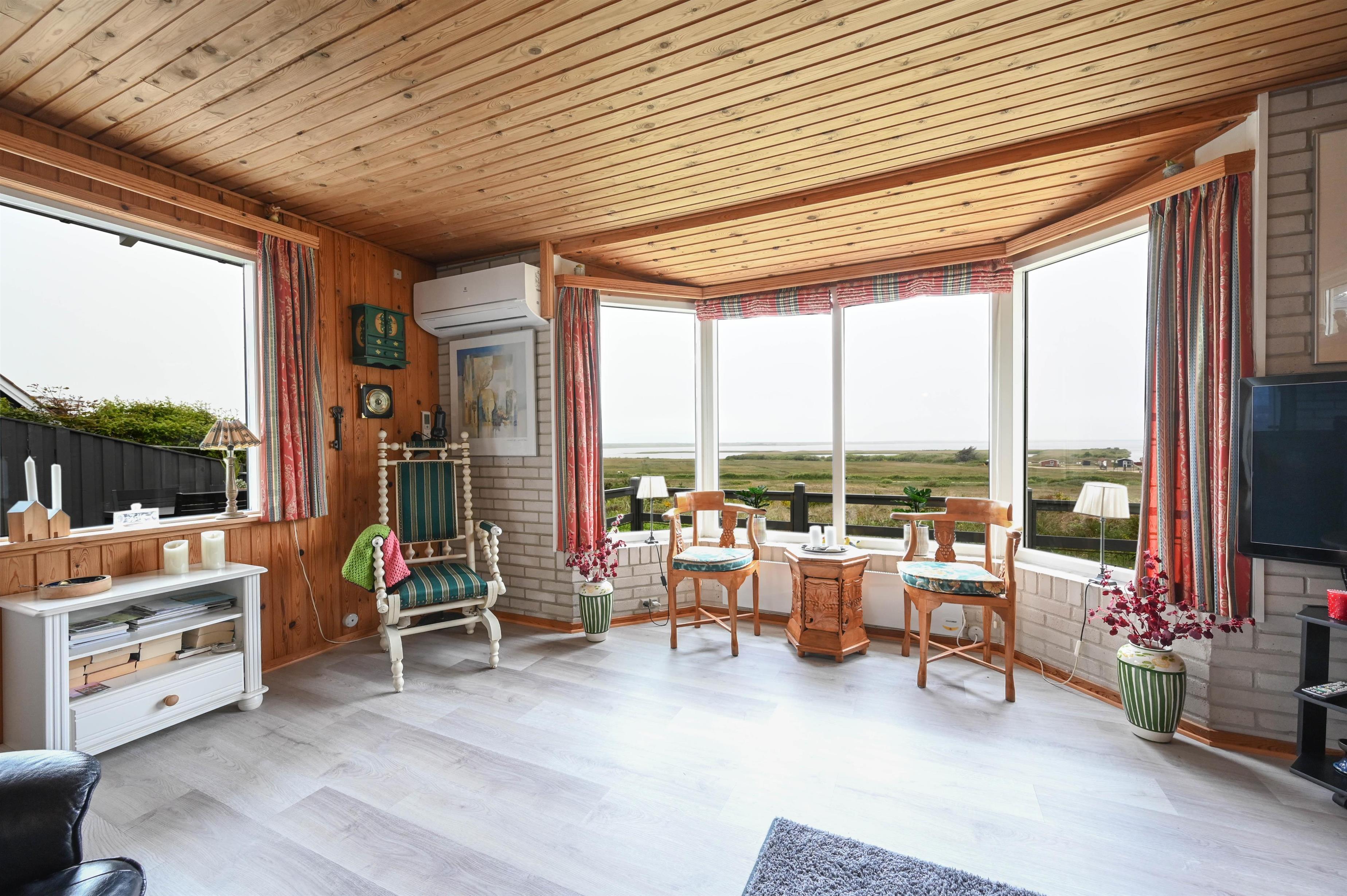 Højt beliggende på skrænten ved Helmklit Havn, med en enestående 180 graders udsigt over Nissum Fjord og med klitterne og Thorsminde i horisonten, finder du dette charmerende og hyggelige feriehus.