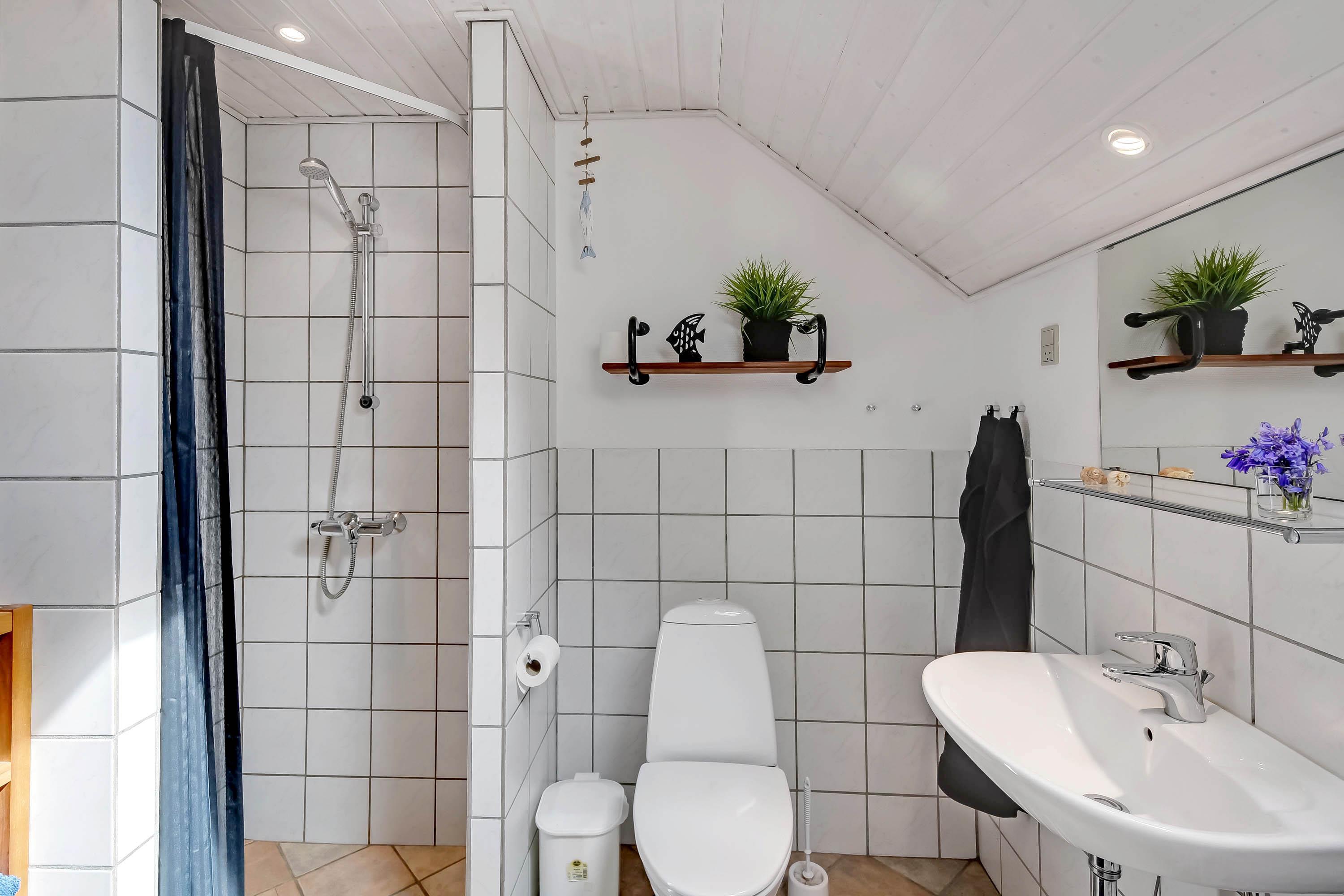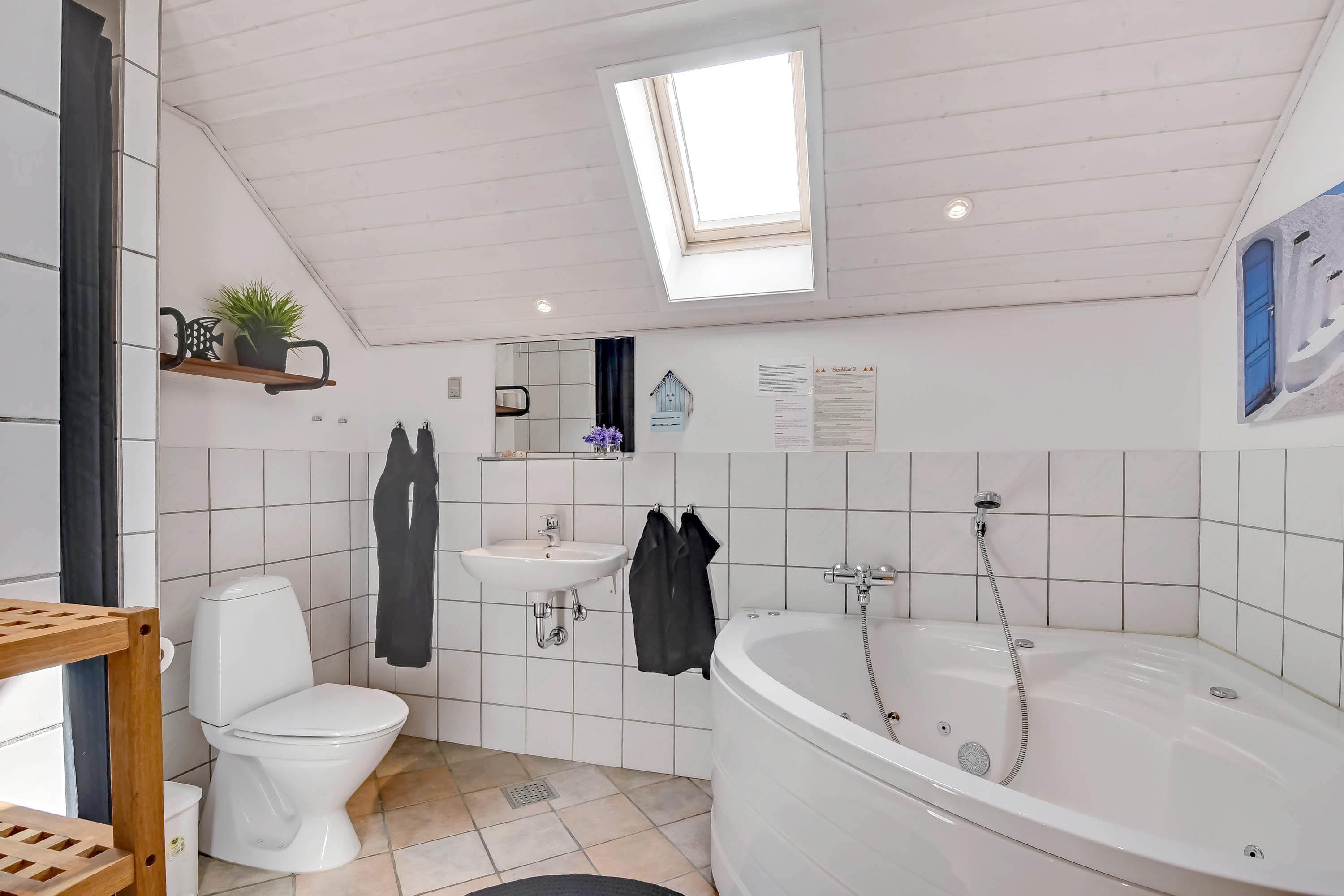 Badeværelset er indrettet med bruseniche, spa og sauna – ideelt til afslapning efter en dag ved havet eller på cykeltur i området.