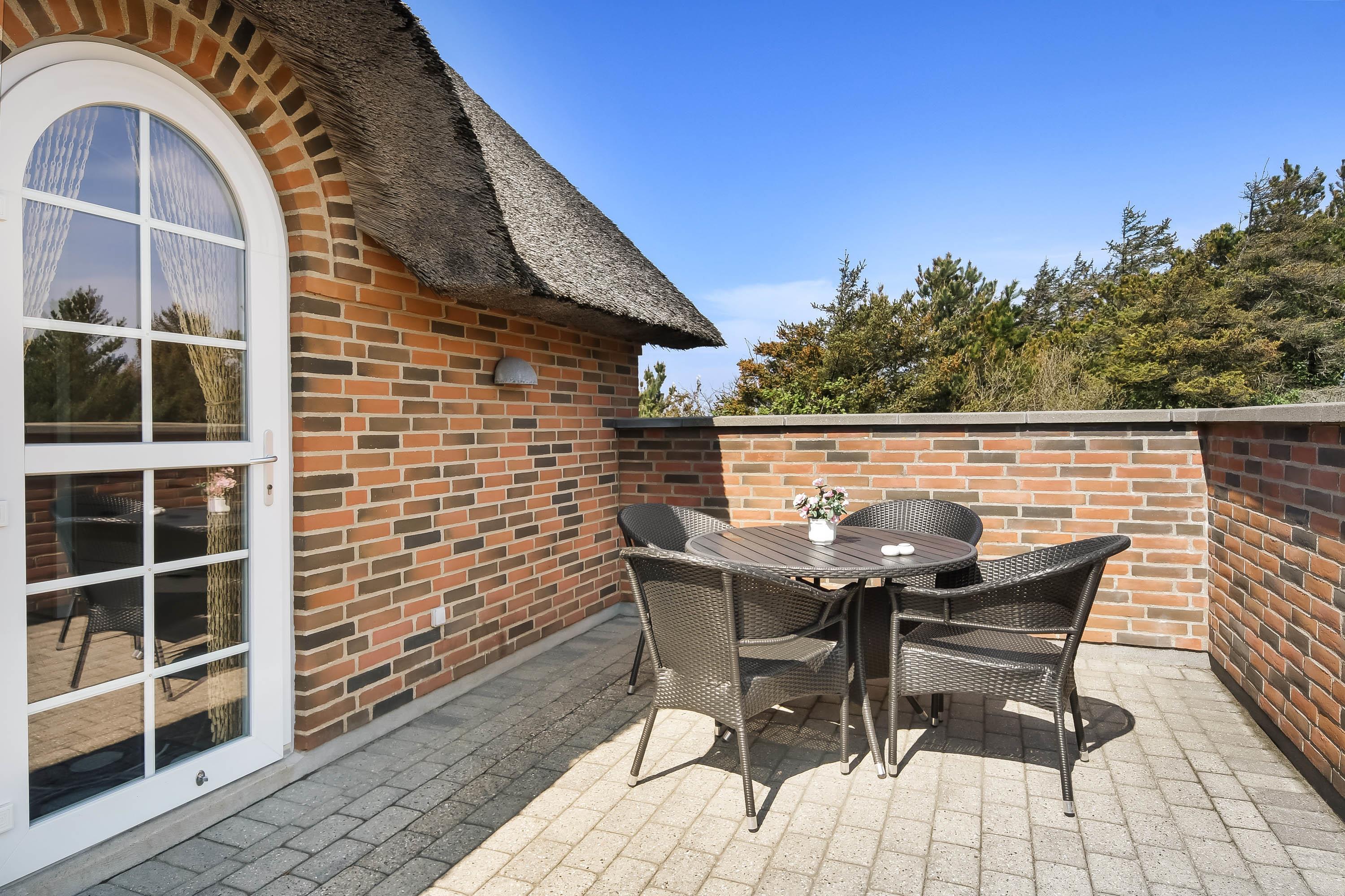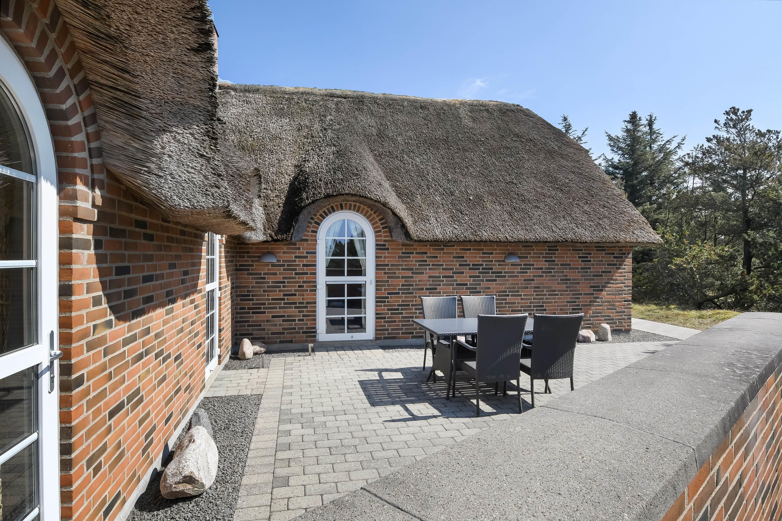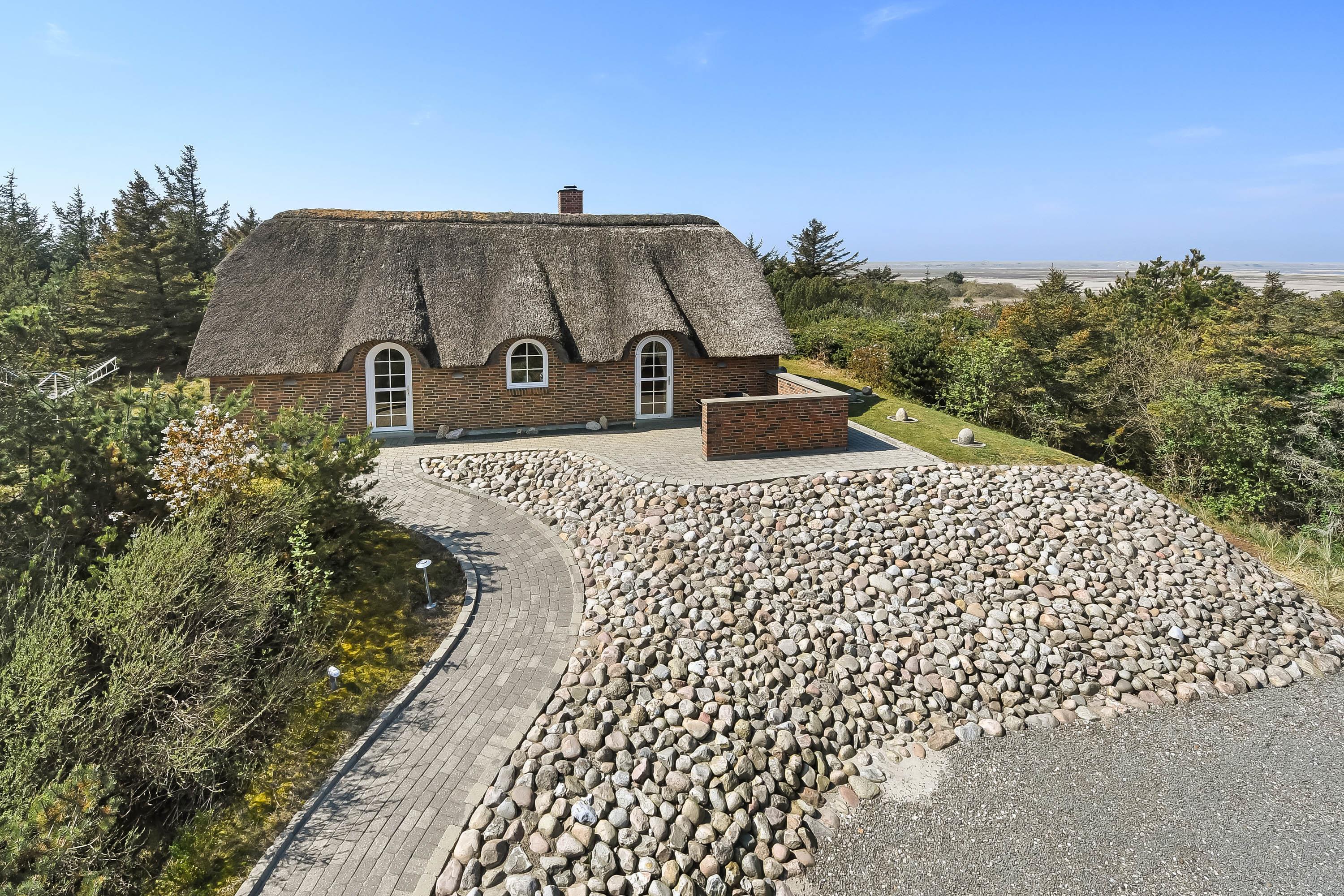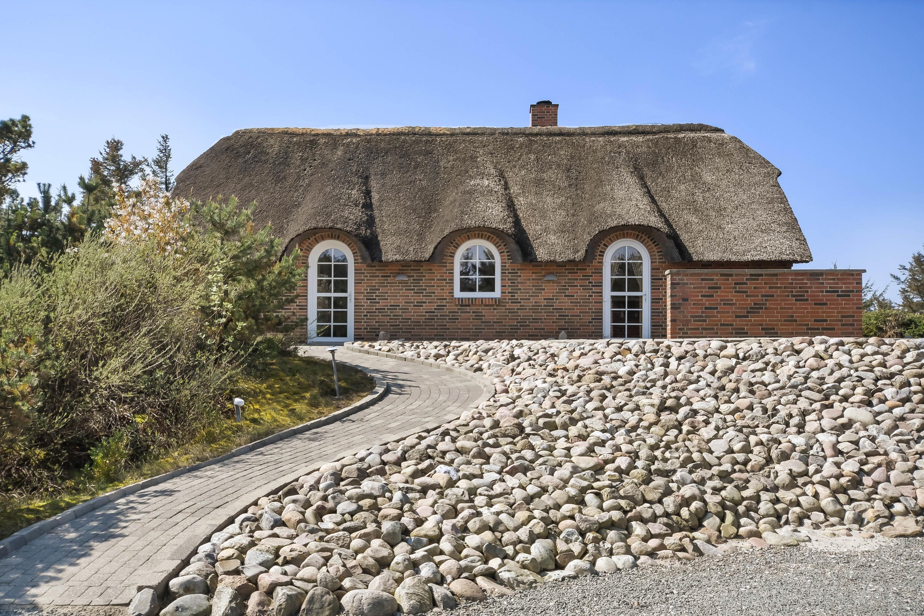Feriehuset fremstår yderst velholdt – både ude og inde – og er bygget i smukke mursten med et klassisk stråtag, der passer perfekt ind i de naturskønne omgivelser.