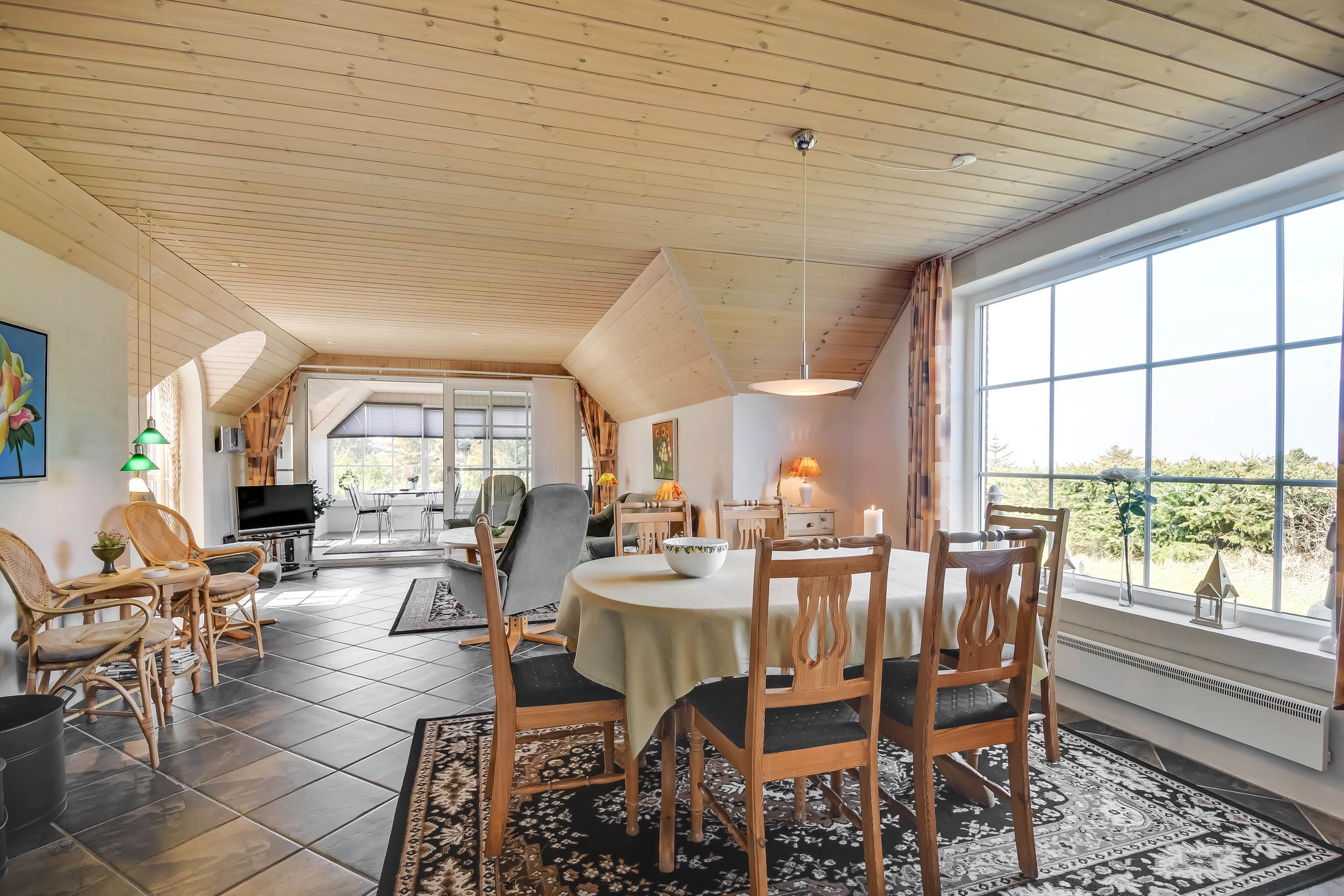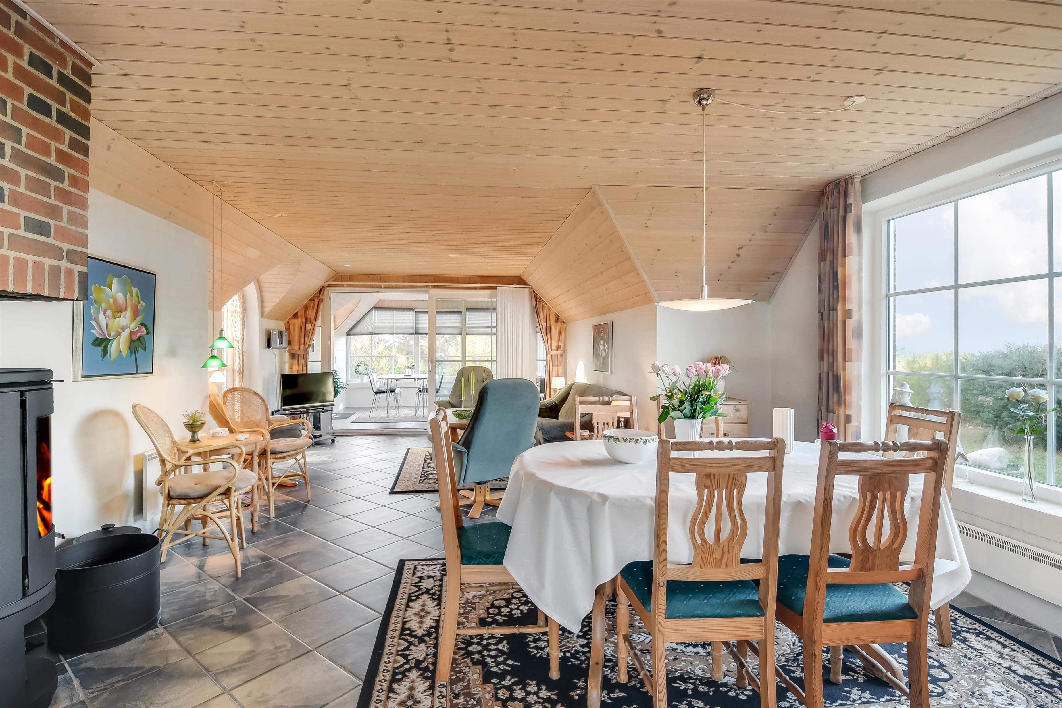 Lys opholdsstue med brændeovn og udsigt til Nissum Fjord