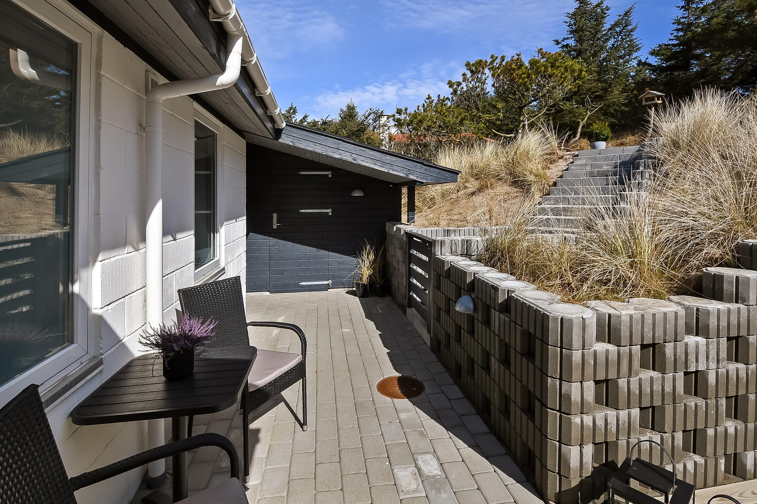 Bagved huset er der en lille bakke med udsigtsterrasse, hvorfra der er frit udsyn over Nissum Fjord, med klitterne i baggrunden. Det perfekte sted til at nyde solnedgangen.